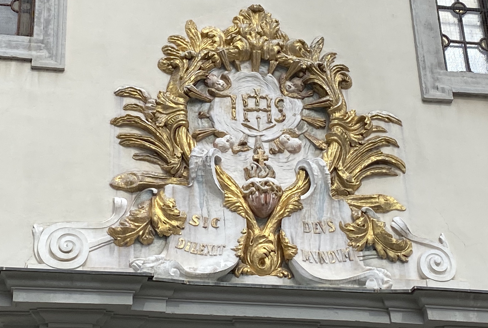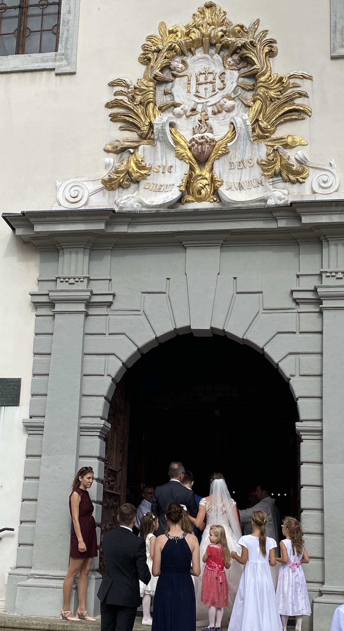 À côté de l’ancien hôtel de ville, une église accueillait un mariage au moment où je faisais ma visite. Et au-dessus du portail de l’église l’inscription en latin biblique Sic Deus dilexit mundum signifie : “Ainsi Dieu a-t-il aimé le monde” ou bien “Dieu a aimé le monde ainsi”. Elle rappelle la phrase de l’évangéliste Saint Jean qui a écrit : “Car Dieu a tant aimé le monde qu’il a donné son Fils unique, afin que quiconque croit en Lui ne périsse point, mais qu’il ait la vie éternelle.”