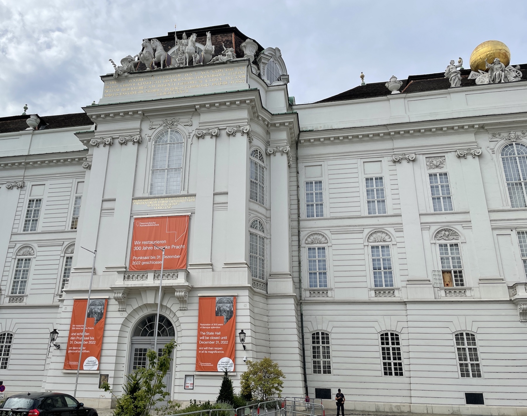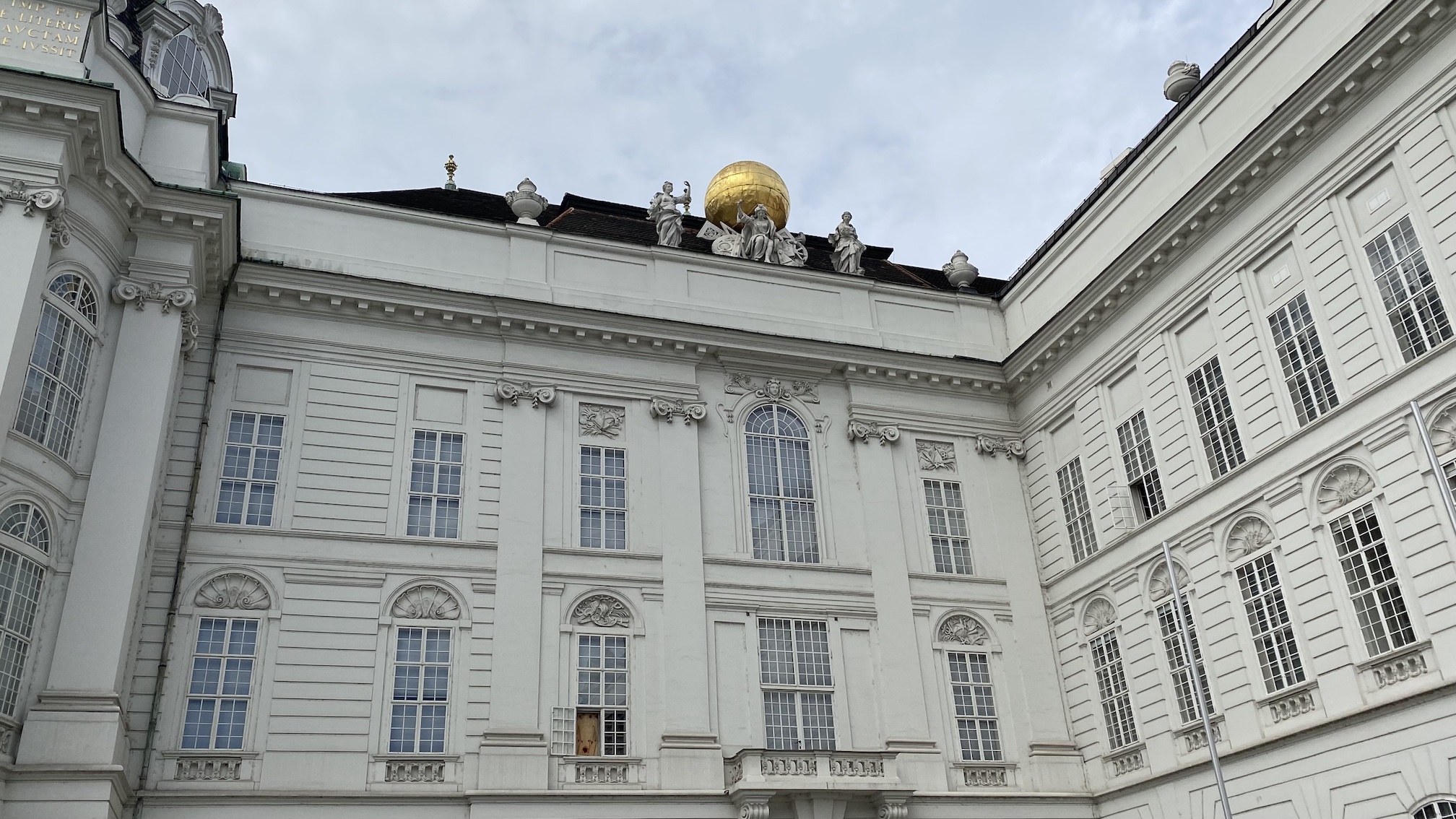 Toujours dans le corps des bâtiments impériaux, voici la Bibliothèque Nationale sur la Josefplatz, prestigieux immeuble orné d’éléments empruntés à l’architecture antique et de deux inscriptions en latin (à la gloire de divers empereurs et de la bibliothèque) :