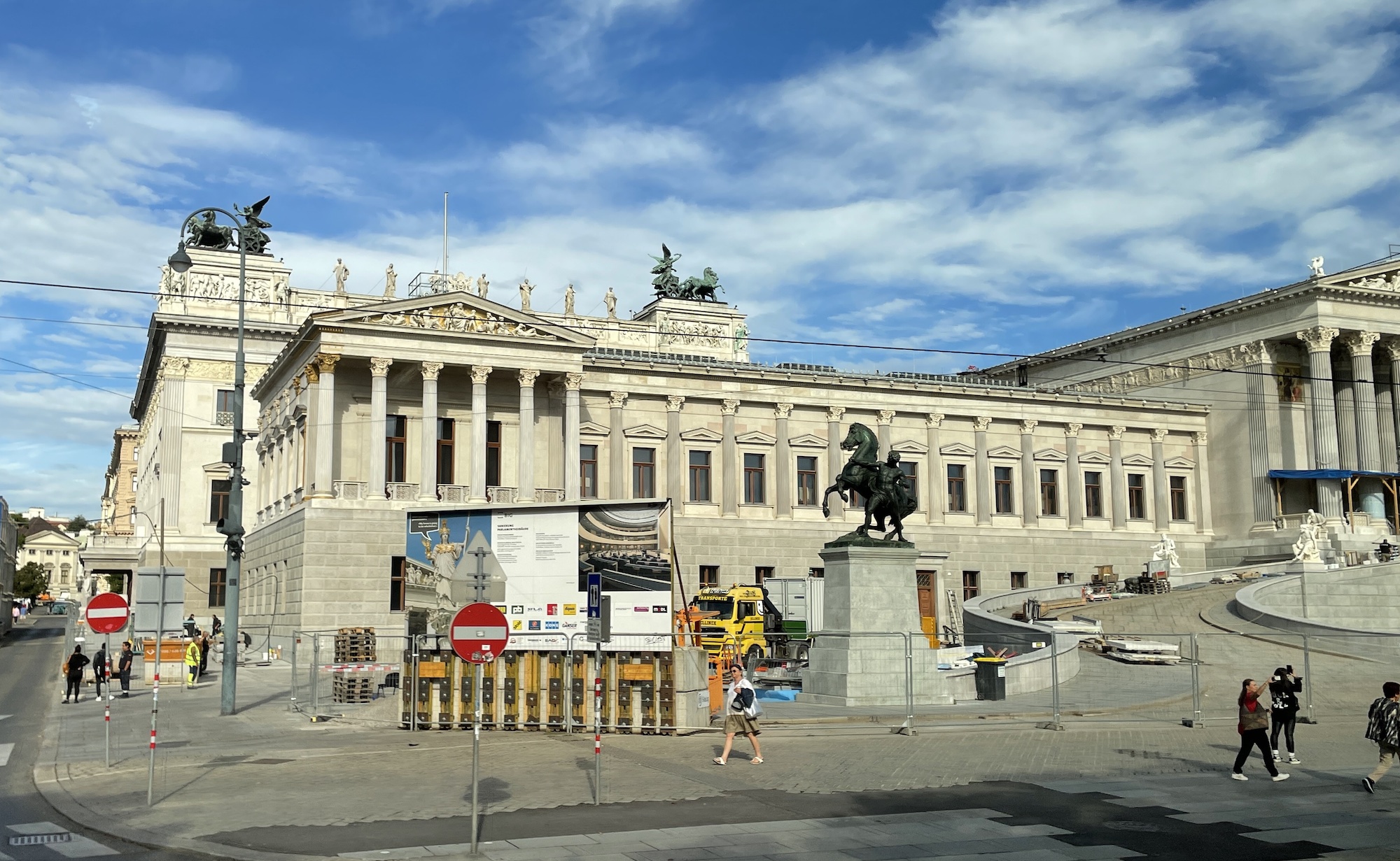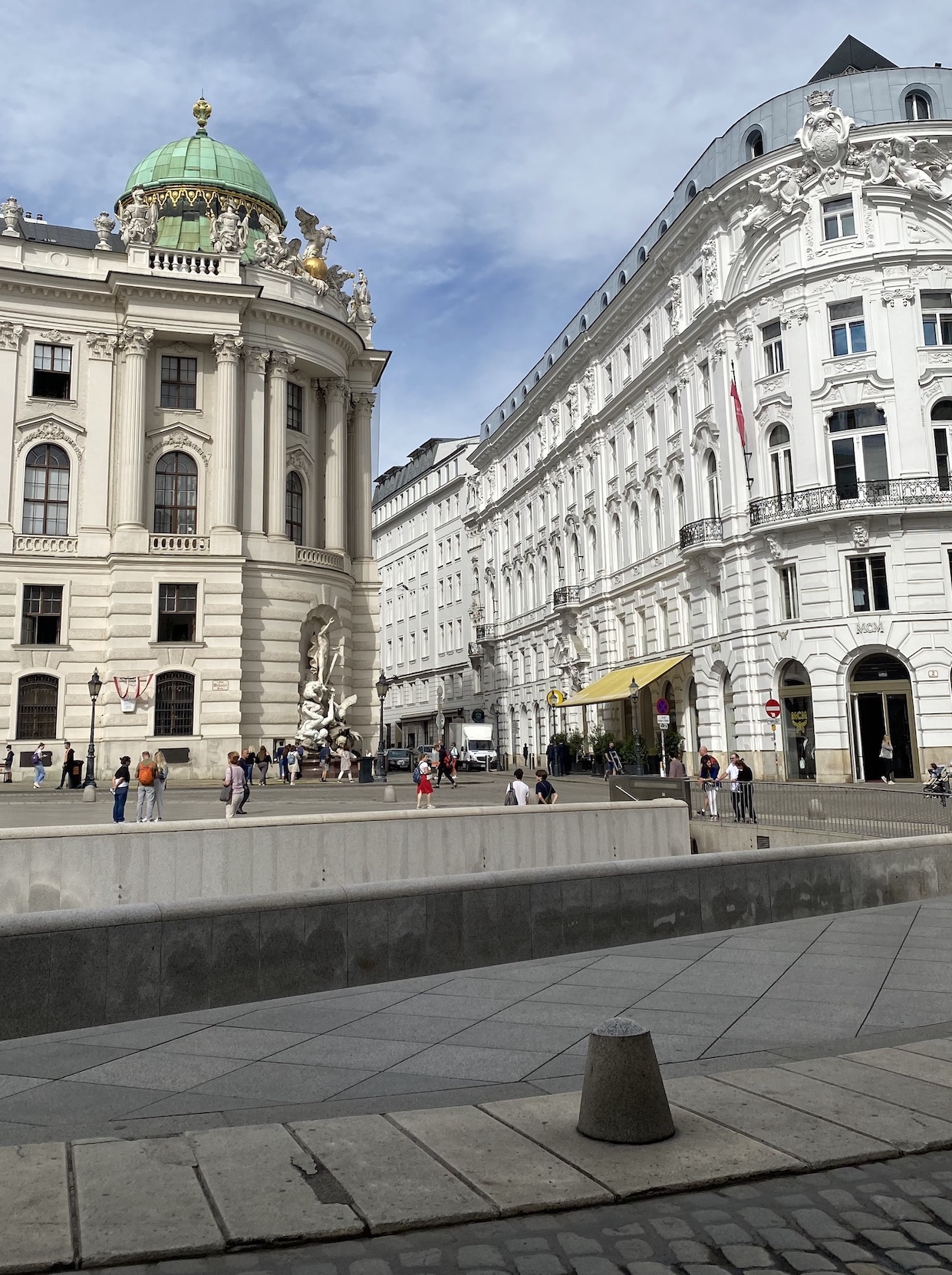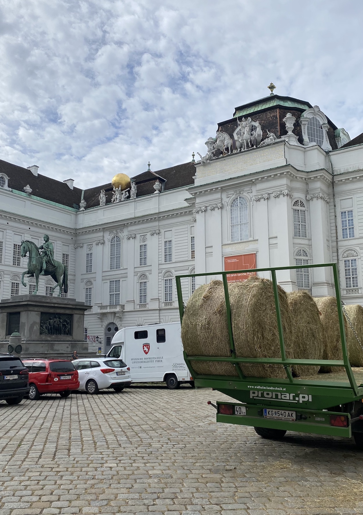 Sur la place elle-même il y avait deux camionnettes apportant de grosses meules de foin. Spectacle un peu surprenant — moins quand on sait que les écuries de la fameuse École espagnole d’équitation (die Spanische Hofreitschule), fondée en 1565, sont tout près de la Josefplatz.