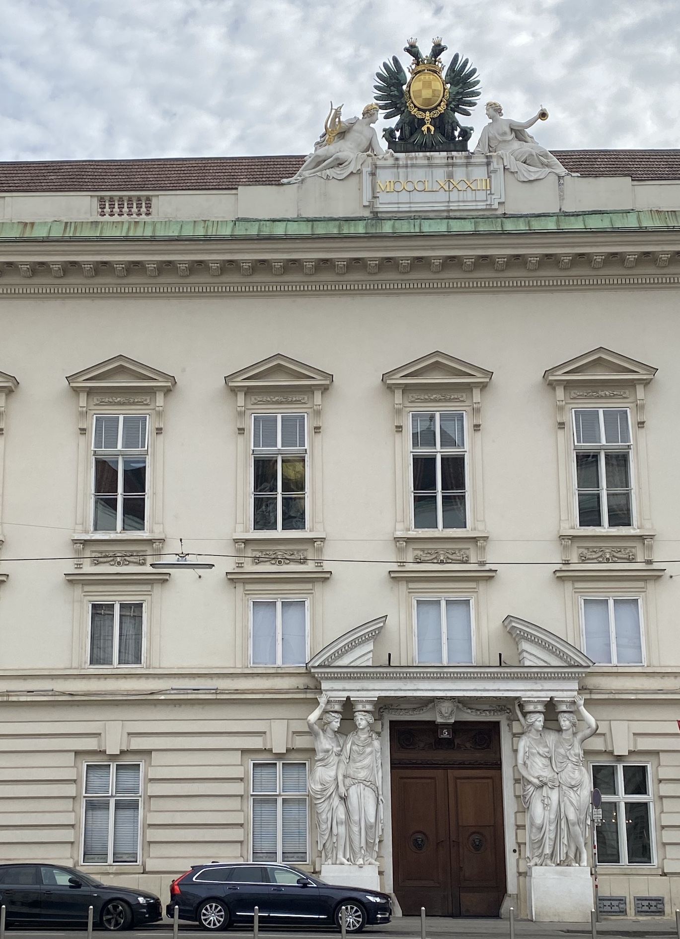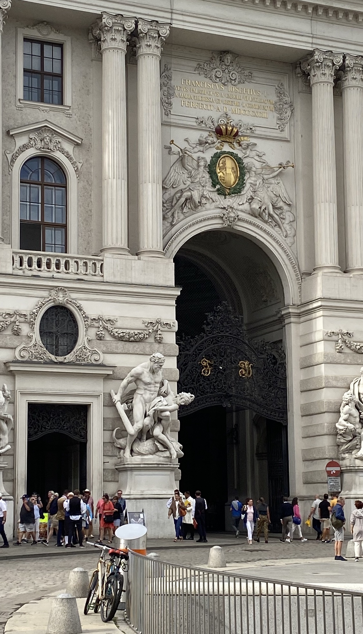 Selon ce que j’ai pu lire (Franciscus Josephus I … perfecit A.D. MDCCCXCIII), c’est sous l’empereur François-Joseph 1er que s’est achevée la construction de ce palais, en 1893. D’autre part, les sculptures entourant ou surmontant le portail rappellent le monde antique, notamment les armoiries arborant l’aigle à deux têtes (l’aigle figurait sur les enseignes de la légion romaine).