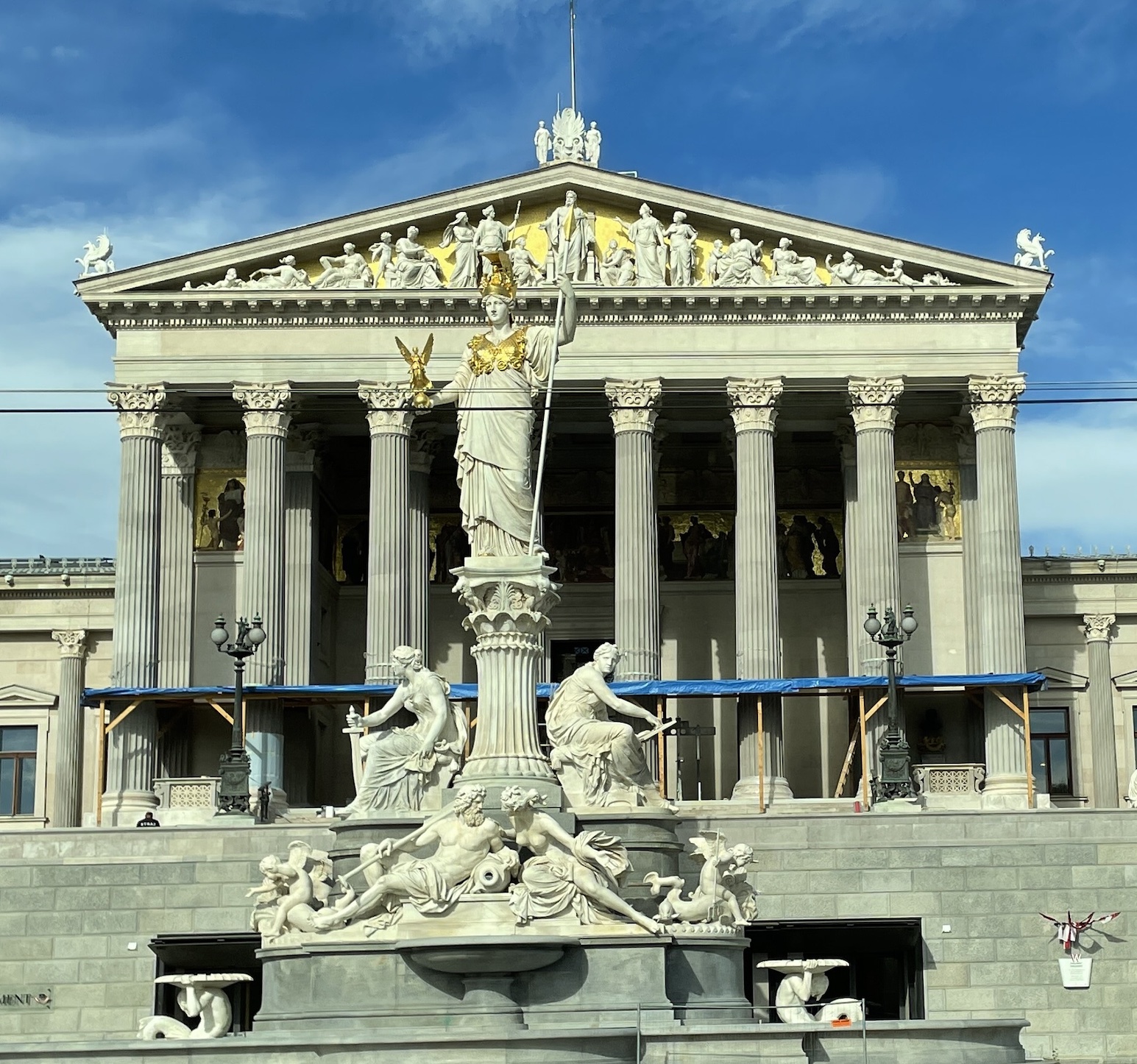 Son architecture rappelle les antiques monuments de l’Acropole d’Athènes. En effet, à quelques différences près, l’entrée du Parlement autrichien ressemble beaucoup au Parthénon grec, et la grande statue à une de celles de la déesse Athéna.
