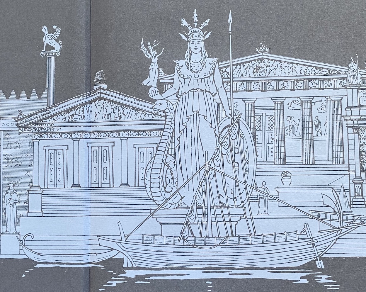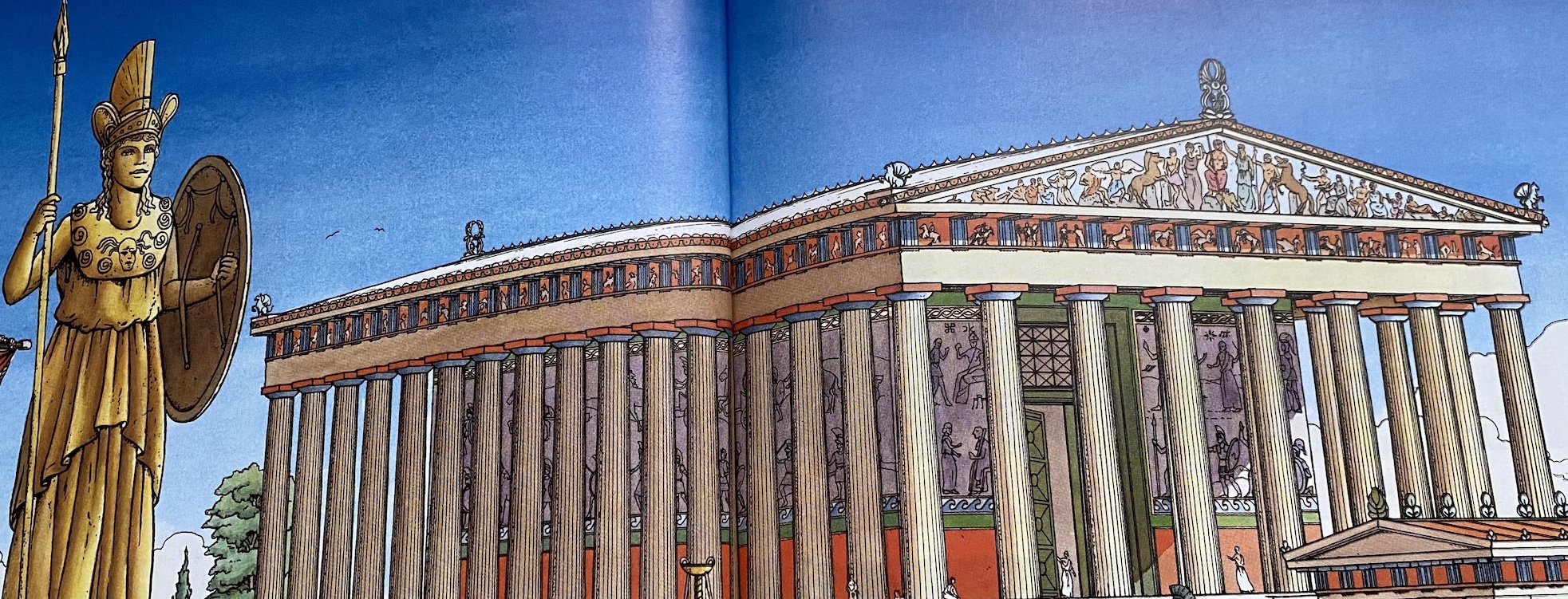 Quant à la représentation d’Athéna, dont les reconstitutions dessinées proviennent de l’album Athènes de Jacques Martin (éd. Casterman, 2001), elle avait été sculptée par Phidias, au moins sous la forme de deux statues. L’une, Athéna Promachos (qui combat en avant), était placée sur l’Acropole ; l’autre, l’Athéna chryséléphantine (en or et en ivoire), déposée dans le Parthénon, où elle recevait un culte fervent en tant que protectrice d’Athènes.