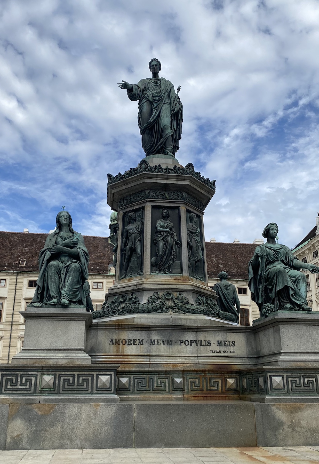 Sur le socle orné d’une frise de méandres à la grecque, l’inscription latine (Amorem meum populis meis) pérennise la relation d’amour du souverain pour ses sujets, qui étaient alors diverses populations d’Autriche, de Hongrie et d’autres pays sur lesquels régnait l’empereur établi à Vienne.