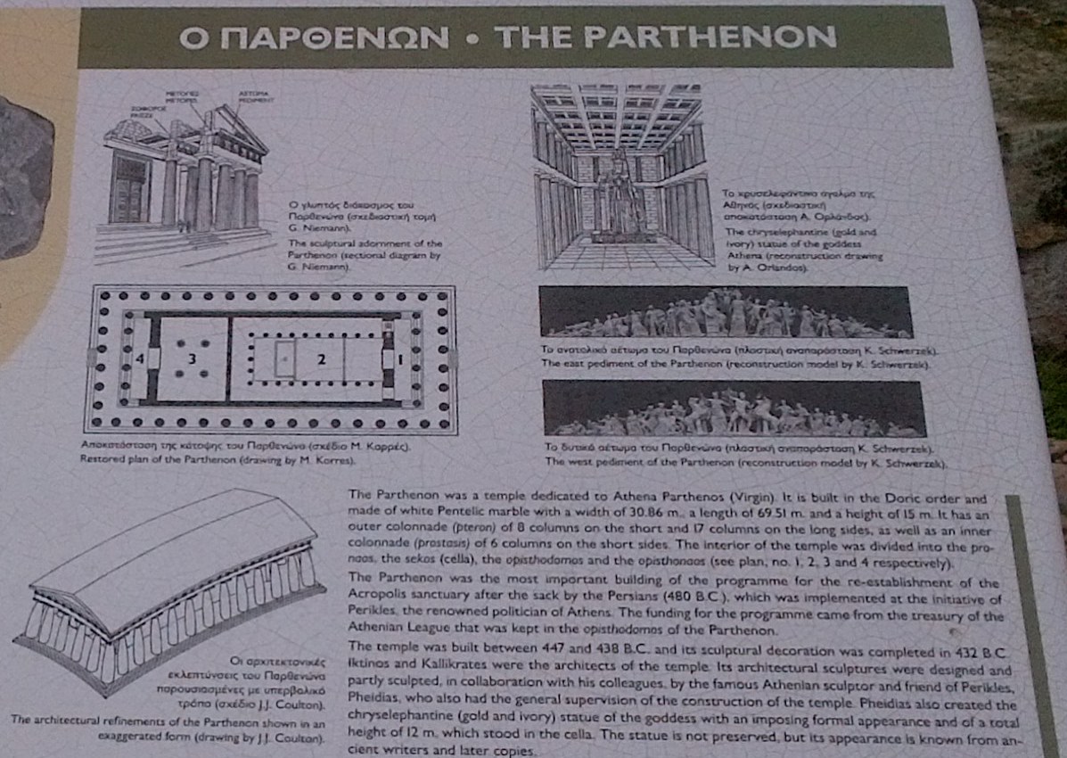 Temple d’Athéna Parthénos (“temple de la vierge”), construit sous l’administration de Périclès, le Parthénon fut commencé en 447 av. J.-C., et consacré, avec la statue de culte d’Athéna, en 438. L’architecte était Ictinos, assisté par Callicratès, et le travail fut supervisé par Phidias (Dictionnaire de l’Antiquité, coll. Bouquins, éd. Robert Laffont, p. 724).