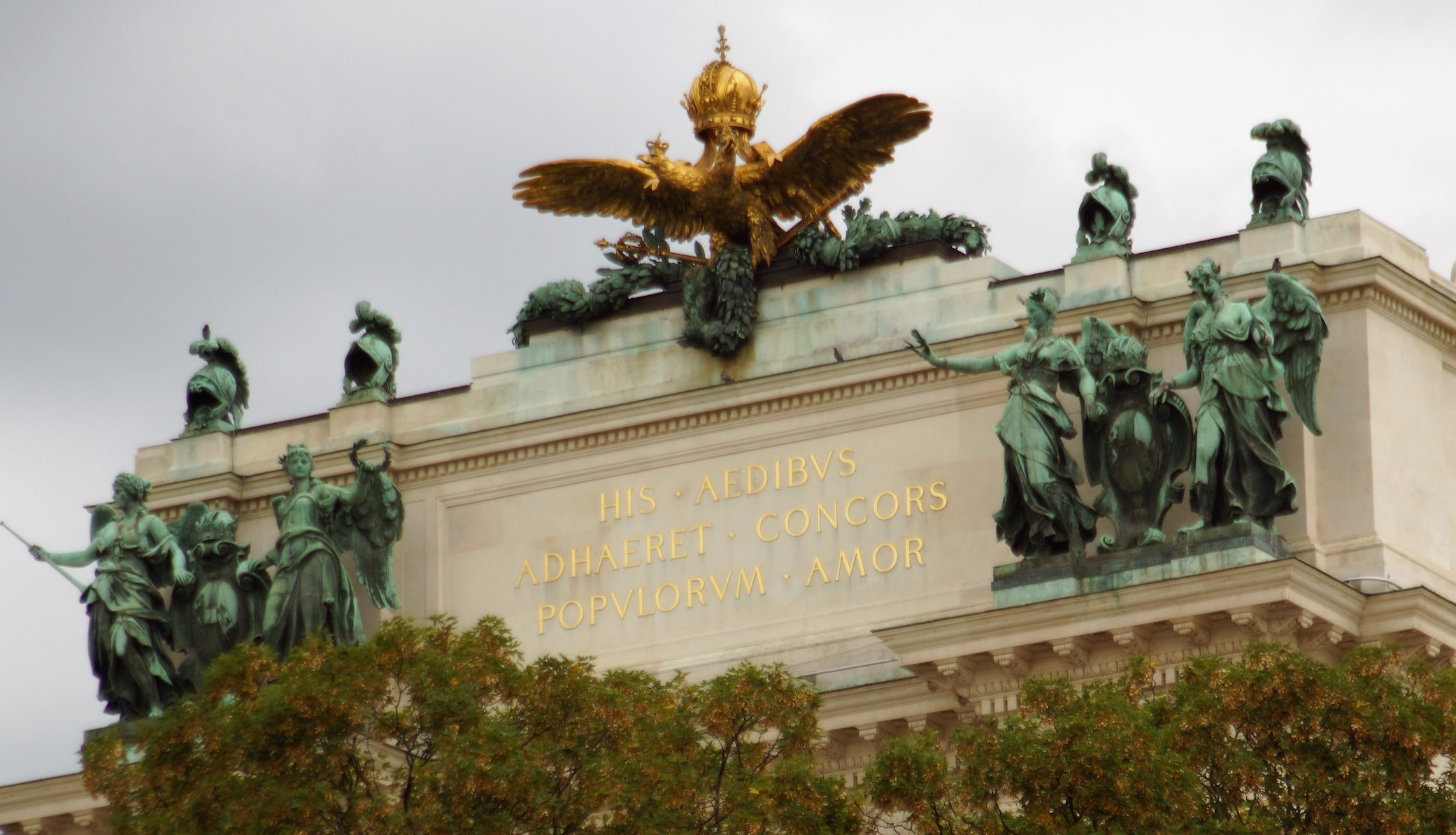 Ensuite, je suis allée me promener dans un parc voisin du palais et j’ai encore vu un immense bâtiment porteur d’allégories antiques et d’une inscription en latin : His aedibus adhaeret concors populorum amor (À cette demeure est attaché l’amour qui unit les cœurs des peuples). Comme sur le socle de la statue d’Auguste, l’amour du souverain pour ses sujets est gravé dans la pierre !