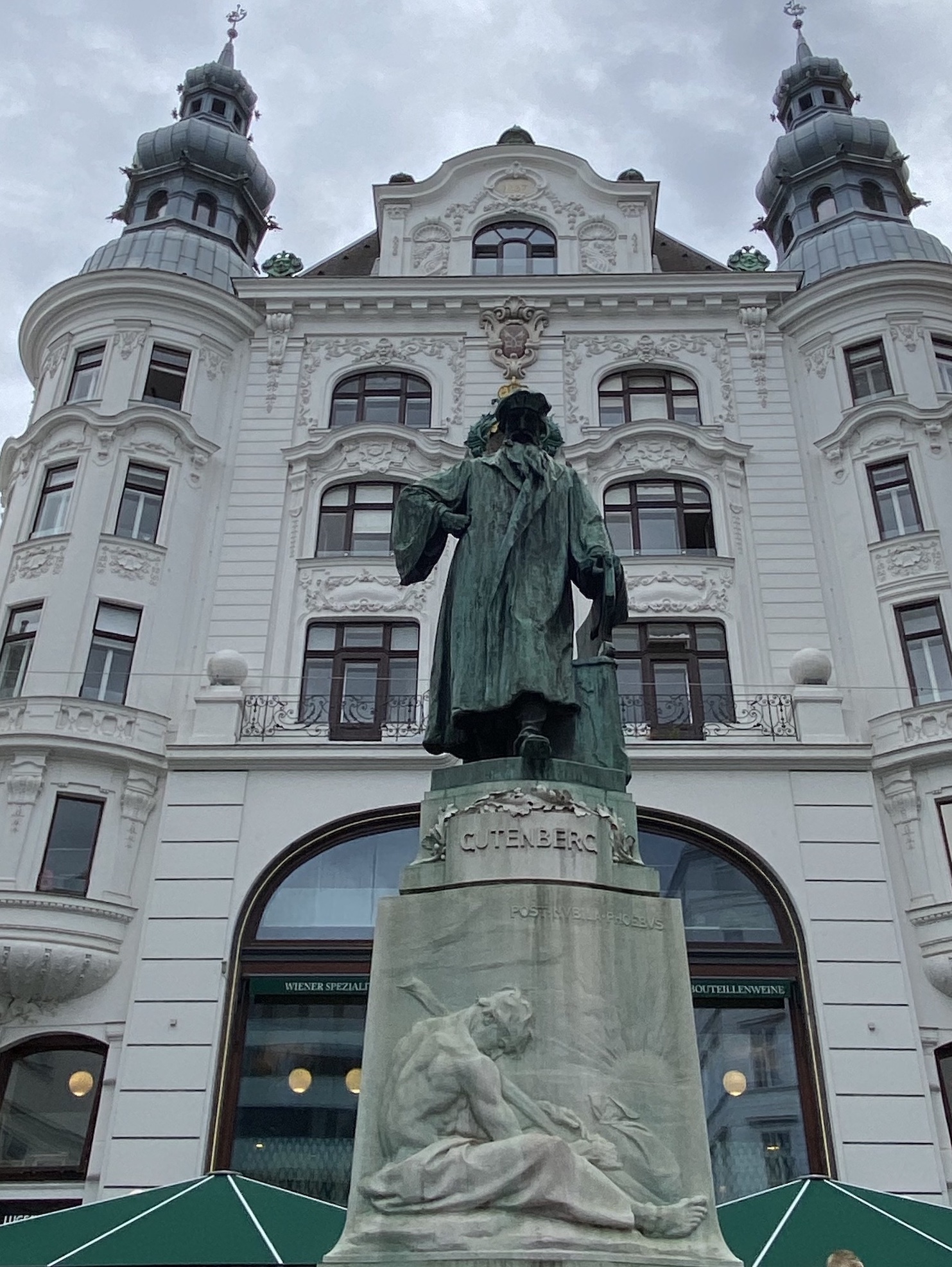 Pourquoi Gutenberg de Mayence est-il représenté à Vienne ? Je ne sais pas, mais je sais que la devise latine écrite sur le socle de la statue Post nubila Phœbus (littéralement, “Après les nuages, Phébus”) symbolise la Connaissance. En effet, Phébus (en grec, Phoibos, le brillant) est l’épithète homérique du dieu Apollon, souvent assimilé à Hélios, le Soleil. D’ailleurs, le soleil rayonne sur la partie droite (progressive) du socle. “Les nuages” obscurcissent et accablent, tandis que “Phébus” éclaire et réchauffe — c’est, symboliquement, le passage de l’obscurité de l’ignorance à la lumière de la connaissance. Grâce à l’imprimerie, la Connaissance rayonne. Merci, Gutenberg !