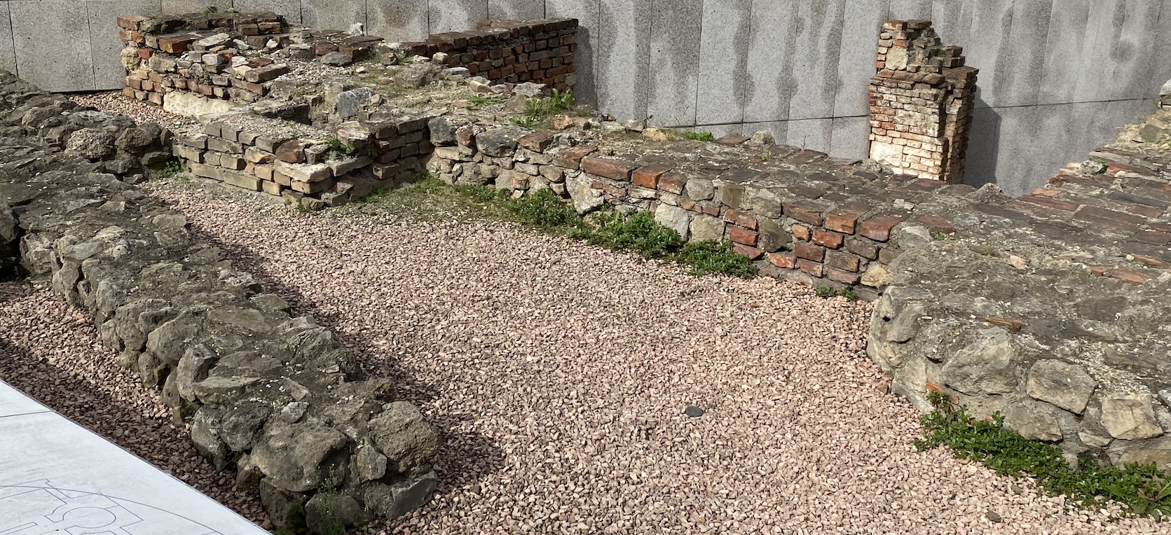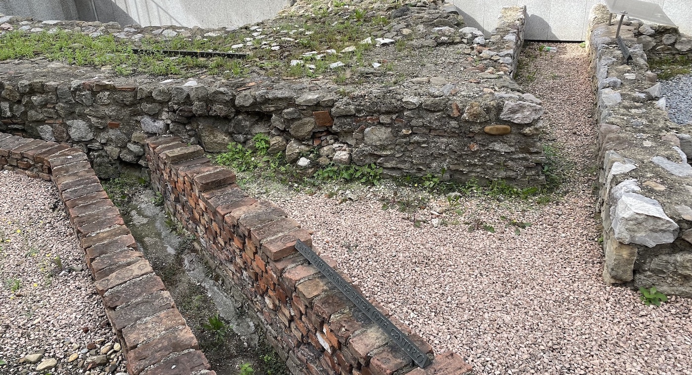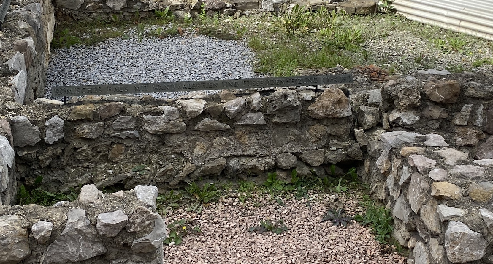 Deux petites pancartes en métal portent des inscriptions en allemand et en anglais. Sur l’une, on distingue les mots Kanal (19 JH) – Drainage system (canalisation du XIXè siècle). Il s’agit d’une infrastructure moderne. Sur l’autre, les mots Römisches Haus mit Wandmalereien und Fussbodenheizung (2-4 JH) signifient que ce sont les restes d’une maison romaine, datant du IIè au IVè siècle, qui possédait des peintures murales et un système de chauffage par le sol, en-dessous du plancher, appelé hypocauste.