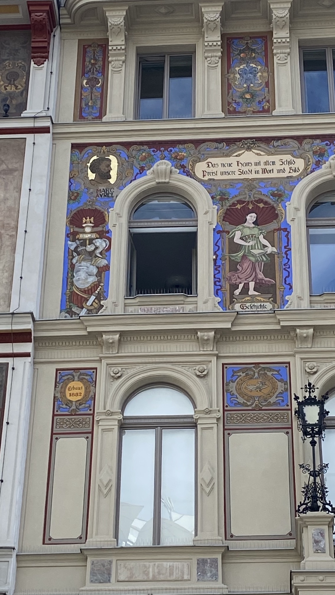 On y voit deux vers en allemand : Das neue Haus mit altem Schild / Preist unsere Stadt in Wort und Bild (La nouvelle maison avec son ancienne enseigne célèbre notre ville en parole et image). Et parmi les images, la muse de l’Histoire (Geschichte, en allemand, Clio pour les Gréco-romains) côtoie l’empereur romain Marc-Aurèle, dont l’effigie surmonte un faisceau d’armes et l’acronyme SPQR.