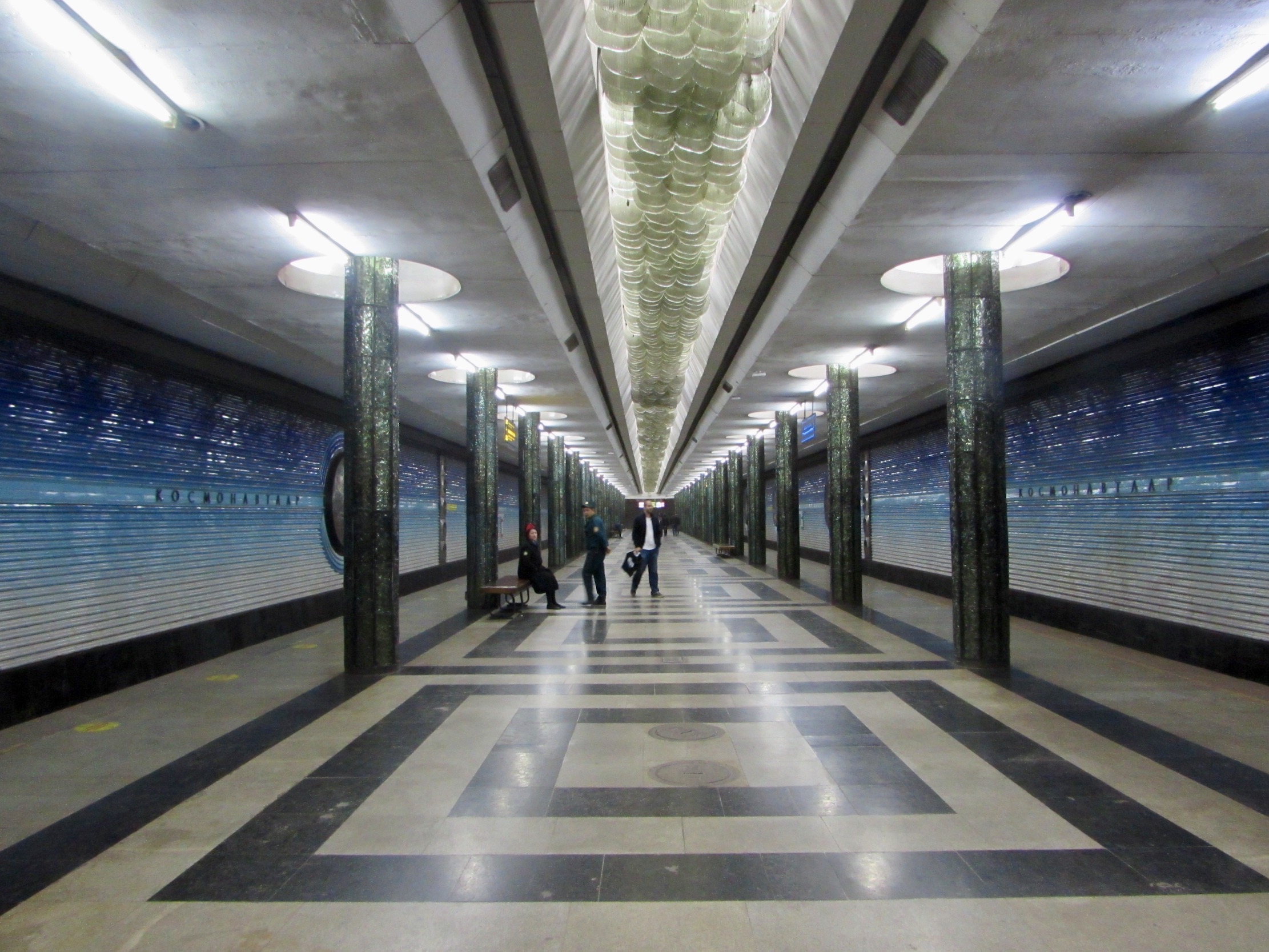 En l’honneur de ces prouesses scientifiques, la station des Cosmonautes est parée de bleu, blanc et vert, pour représenter l’infini cosmos. Cette station a d’ailleurs gagné le prix d’architecture de l’URSS en 1984 grâce à l’ingéniosité de ses architectes, S. Sutyagin et S. Solokov, qui ont recouvert les colonnes soutenant la station de céramique brillante verte, pour maintenir une impression d’immensité. Au plafond, un canal décoré de morceaux de verre laiteux symbolise la voie lactée. Le tout, accompagné de formes circulaires et carrées, renvoie une atmosphère absolument futuriste et extraterrestre.