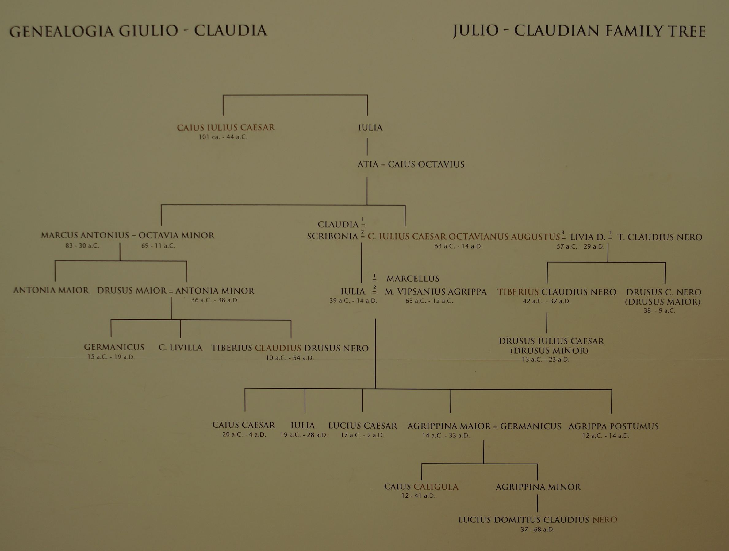 Selon le Dictionnaire de l’Antiquité (coll. Bouquins, éd. Robert Laffont, p. 574), Livie épousa d’abord Tiberius Claudius Nero, dont elle eut pour enfants l’empereur Tibère et Claudius Drusus, père de l’empereur Claude ; puis elle épousa l’empereur Auguste.