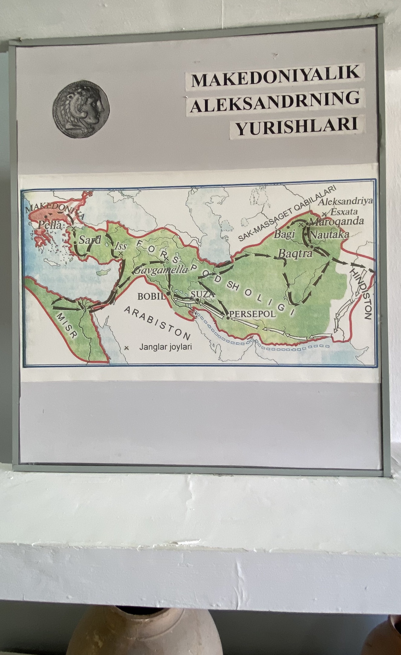 Mais il y a une salle consacrée à l’époque d’Alexandre le Grand et où figure une carte de son empire. La toponymie est en ouzbek : on reconnaît à la frontière Est les noms de “Maroqanda” (alias Maracanda), et de “Alexandriya Esxata” à la frontière extrême-orientale de l’Empire perse, Alexandrie Eschaté, “la plus lointaine” des villes éponymes fondées par Alexandre (Dictionnaire de l’Antiquité, coll. Bouquins, éd. Robert Laffont, p. 34).