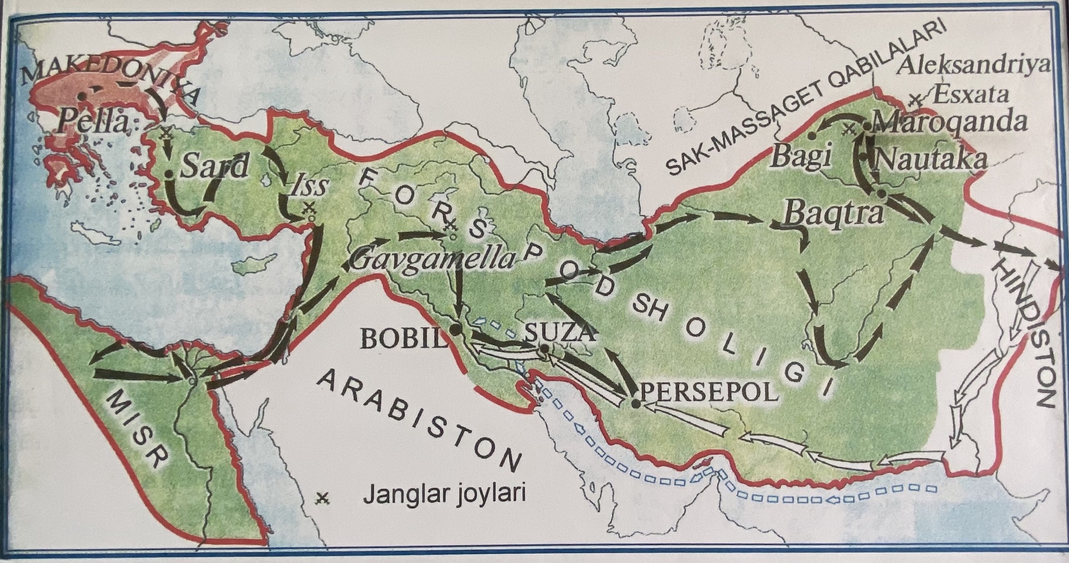 Après avoir successivement conquis, entre 334 et 328, la Grèce, l’Asie Mineure, l’Égypte, et presque tout l’Empire perse, Alexandre, roi macédonien qui aspirait à se comporter comme un héros homérique et vouait une admiration sans bornes à Achille, poursuivit ses campagnes militaires jusqu’aux confins de l’Iran, assujettissant les vastes étendues de l’Hyrcanie, l’Asie, la Drangiane, la Bactriane et la Sogdiane (Dictionnaire de l’Antiquité, p. 33).