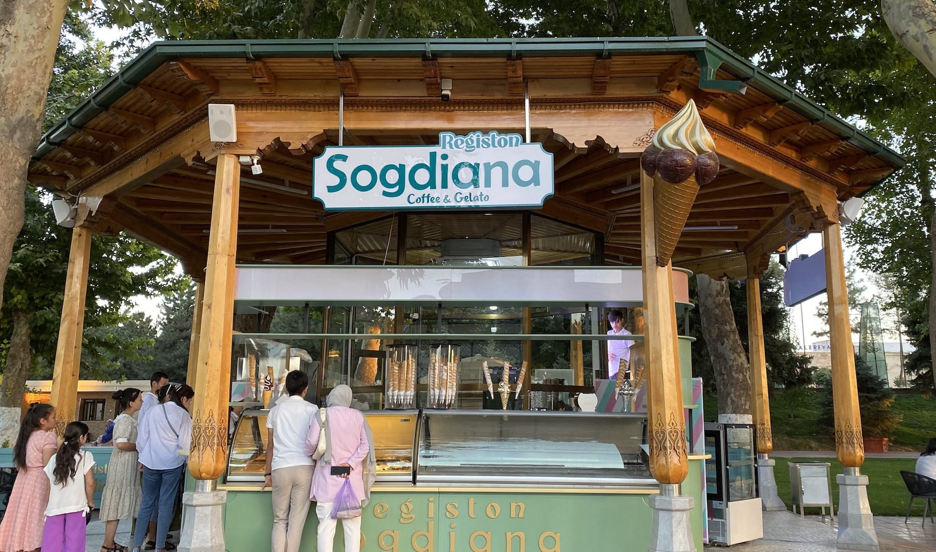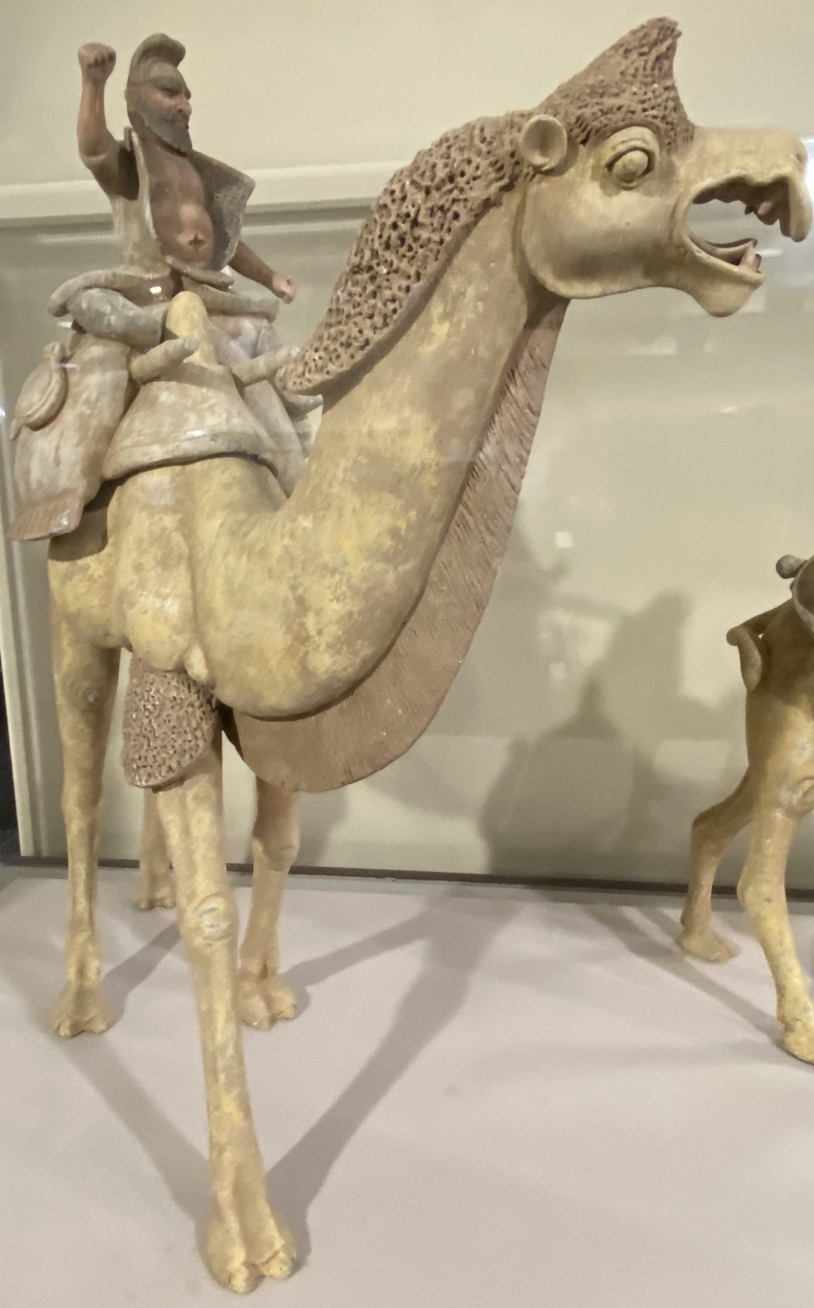 De ces régions, qui furent ensuite tour à tour dominées par les Parthes, les Arabes, puis les Turcs, il reste le nom de “Sogdiana”. Je l’ai vu comme enseigne d’un stand de crèmes glacées situé près du Régistan à Samarcande ! Et lors d’une visite au Musée Belz de Memphis (Tennessee, États-Unis), j’avais admiré la statuette d’un Chamelier sogdien — statuette chinoise datant de la Dynastie Qing (1644-1911) symbolisant l’importance du commerce de la Route de la Soie pour les Chinois et de l’immigration des Sogdiens en Chine (d’après la notice du musée Belz).