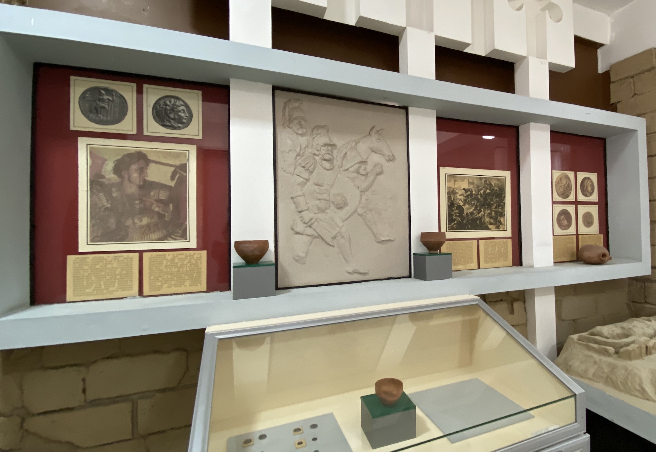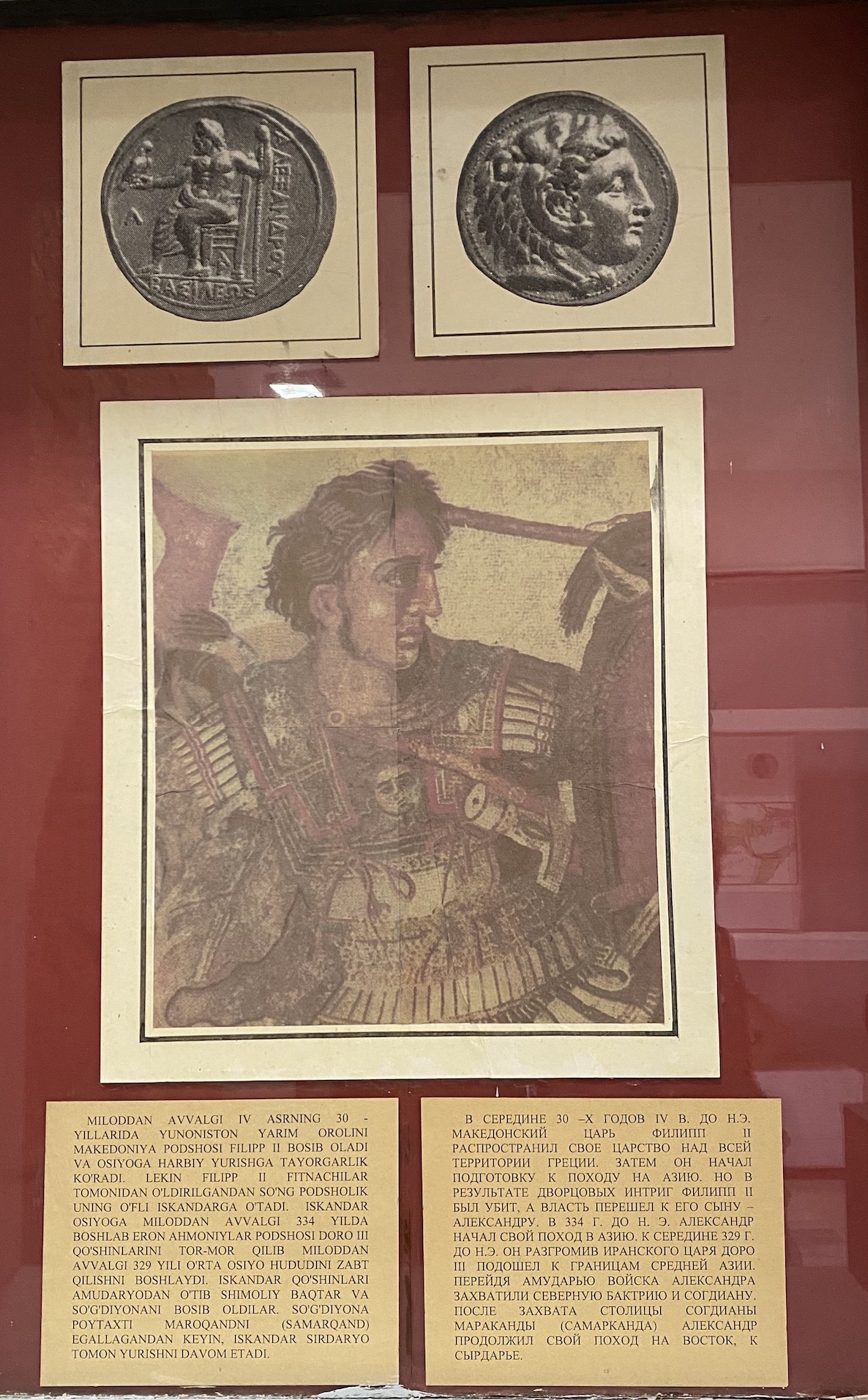 Au Musée Historique de Samarcande, en face de la carte représentant l’étendue de ses conquêtes se trouvent diverses illustrations d’Alexandre, de son entourage et de ses batailles.