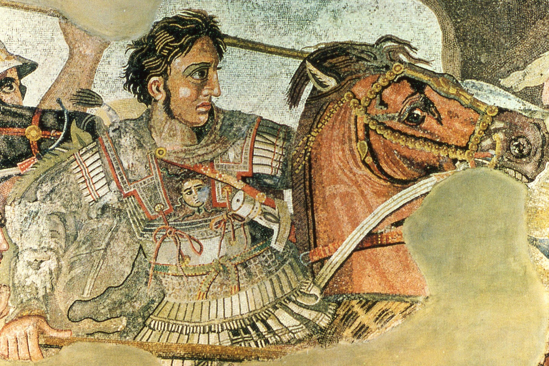 À gauche, le portrait d’Alexandre est la copie d’une mosaïque romaine de Pompéi (exposée au Musée archéologique de Naples) mettant en scène Alexandre et son inséparable cheval Bucéphale lors de la bataille d’Issos contre les Perses. Bucéphale, dont le nom signifie en grec “tête de bœuf”, a une oreille en forme de corne !