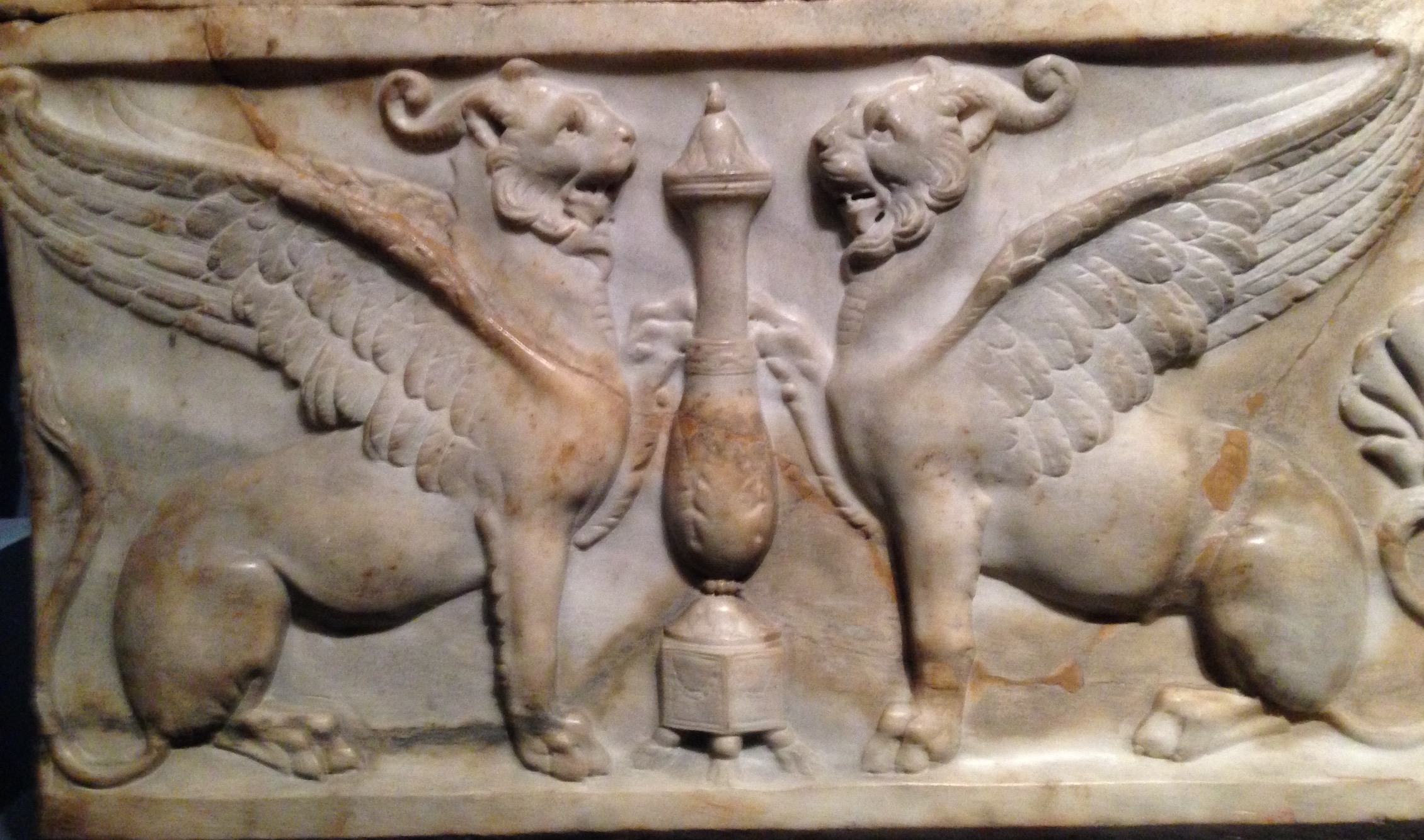 À Baltimore, le sarcophage romain sur lequel figurent des griffons au corps de panthère entourant un vase dédié à Dionysos (Bacchus) symbolisaient l’ascension vers le ciel de l’âme de la personne défunte.