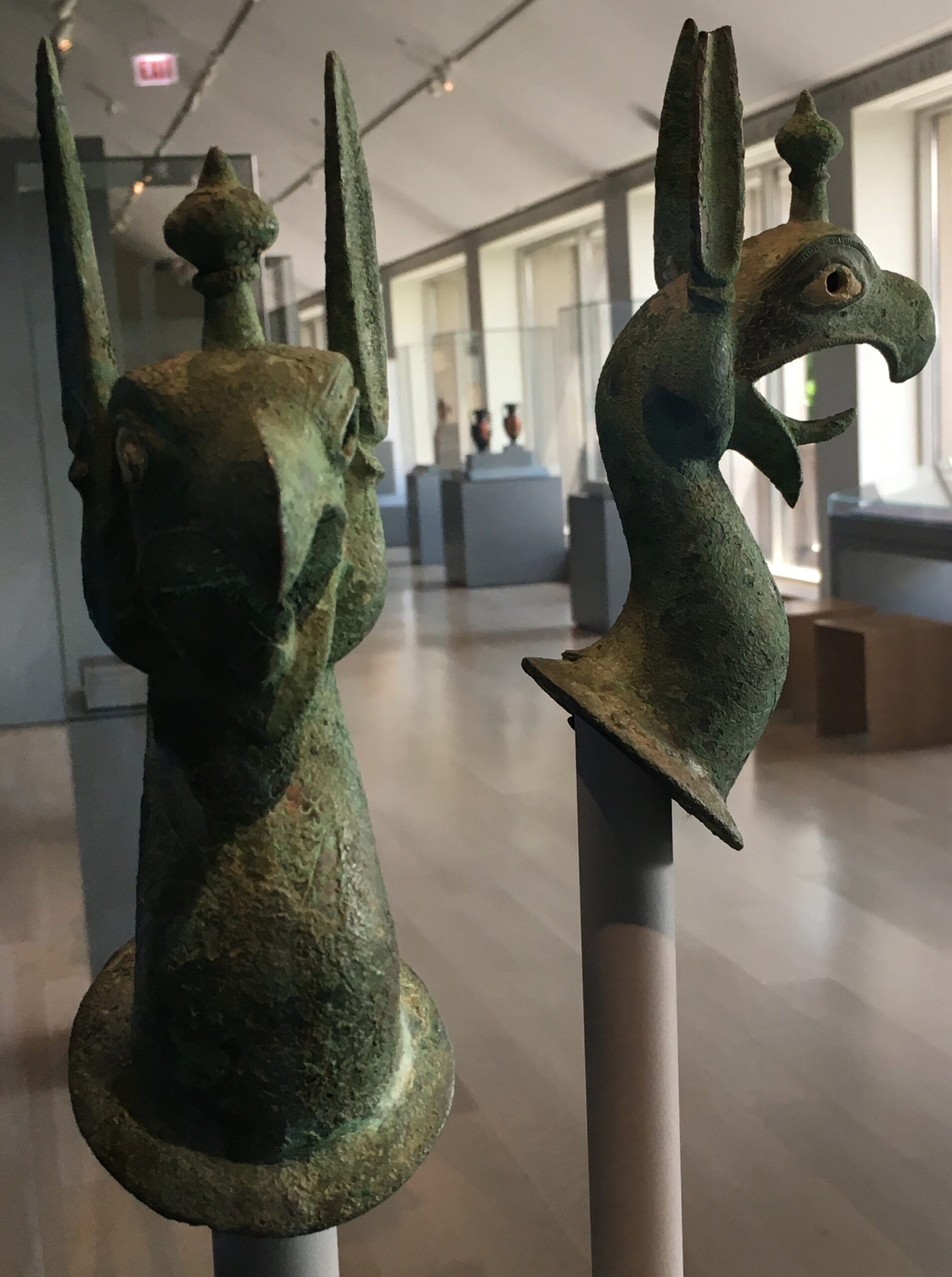 À Chicago, les deux griffons (VIè siècle avant notre ère) d’origine grecque en bronze incrusté d’ivoire ornaient un vase cérémonial dans un sanctuaire religieux. D’autre part, le précieux panneau de stuc (placé en tête de l’article) peint et incrusté d’or est romain (1er siècle) et décorait une riche maison ou bien des thermes (bains publics) : une jeune femme presque entièrement nue tend la main vers un superbe griffon, au corps svelte de chat plus que de lion, et aux ailes et bec d’oiseau.