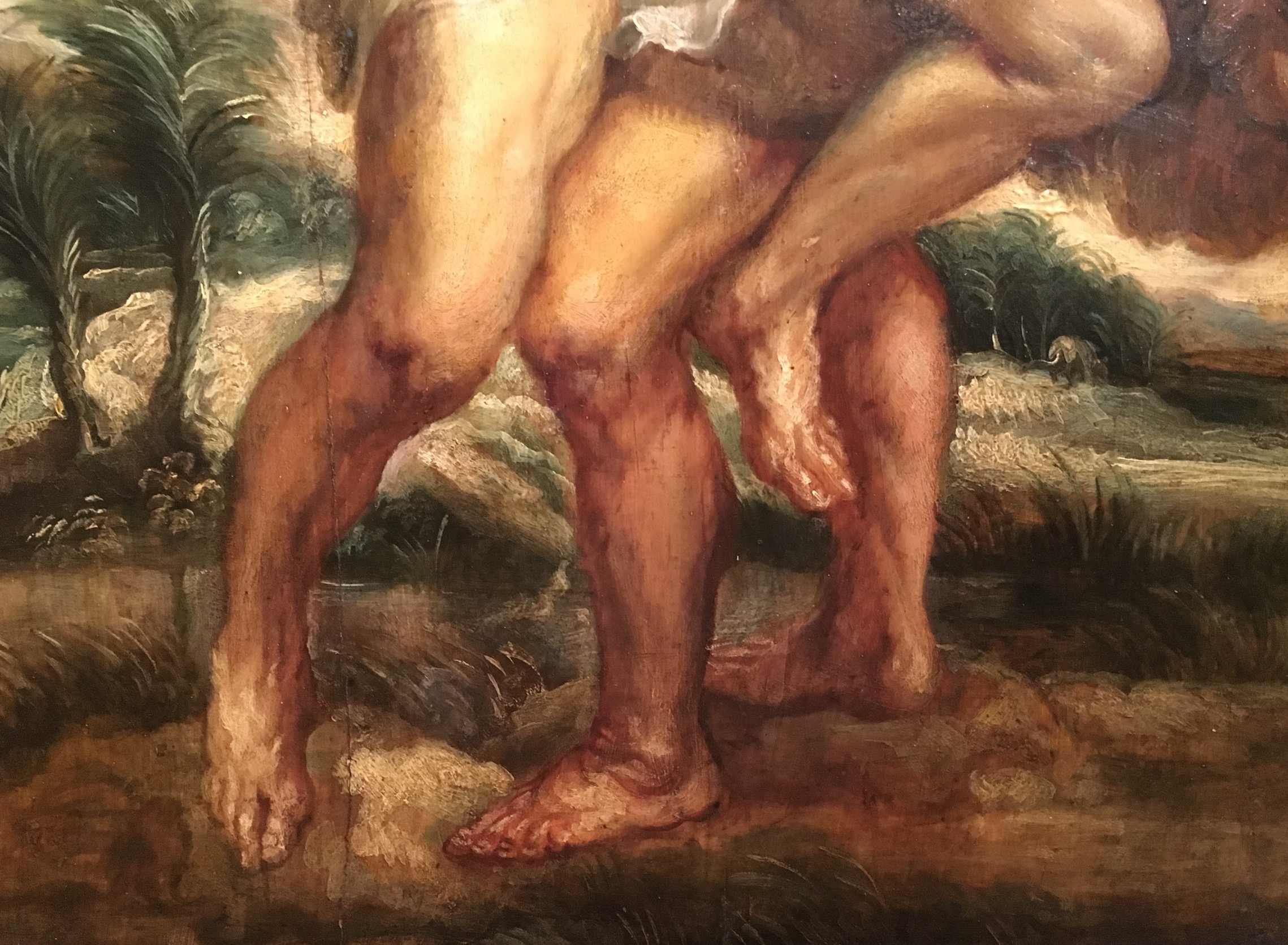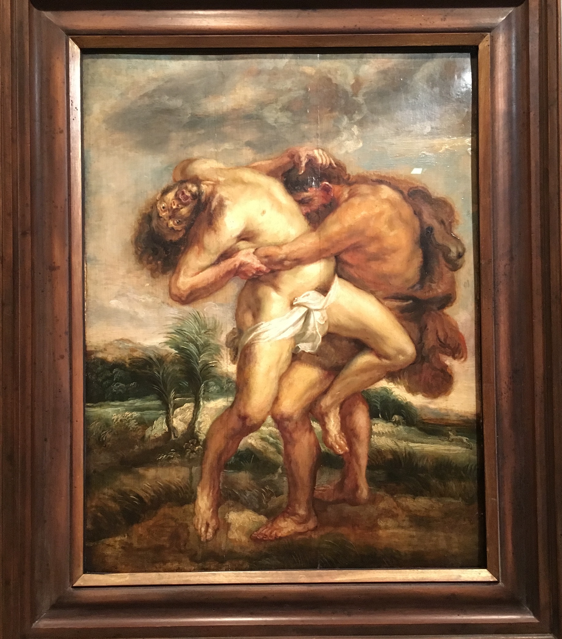 Ce tableau représente le combat d’Hercule et du géant Antée, fils du dieu Poséidon et de Gaïa (la Terre), qui vivait en Libye. Chaque fois qu’il était renversé à terre, il se relevait plus fort grâce à son contact avec sa mère la Terre. Héraclès s’en aperçut, et il le souleva en l’air pour le tuer en l’écrasant (Antiquité, p. 57).