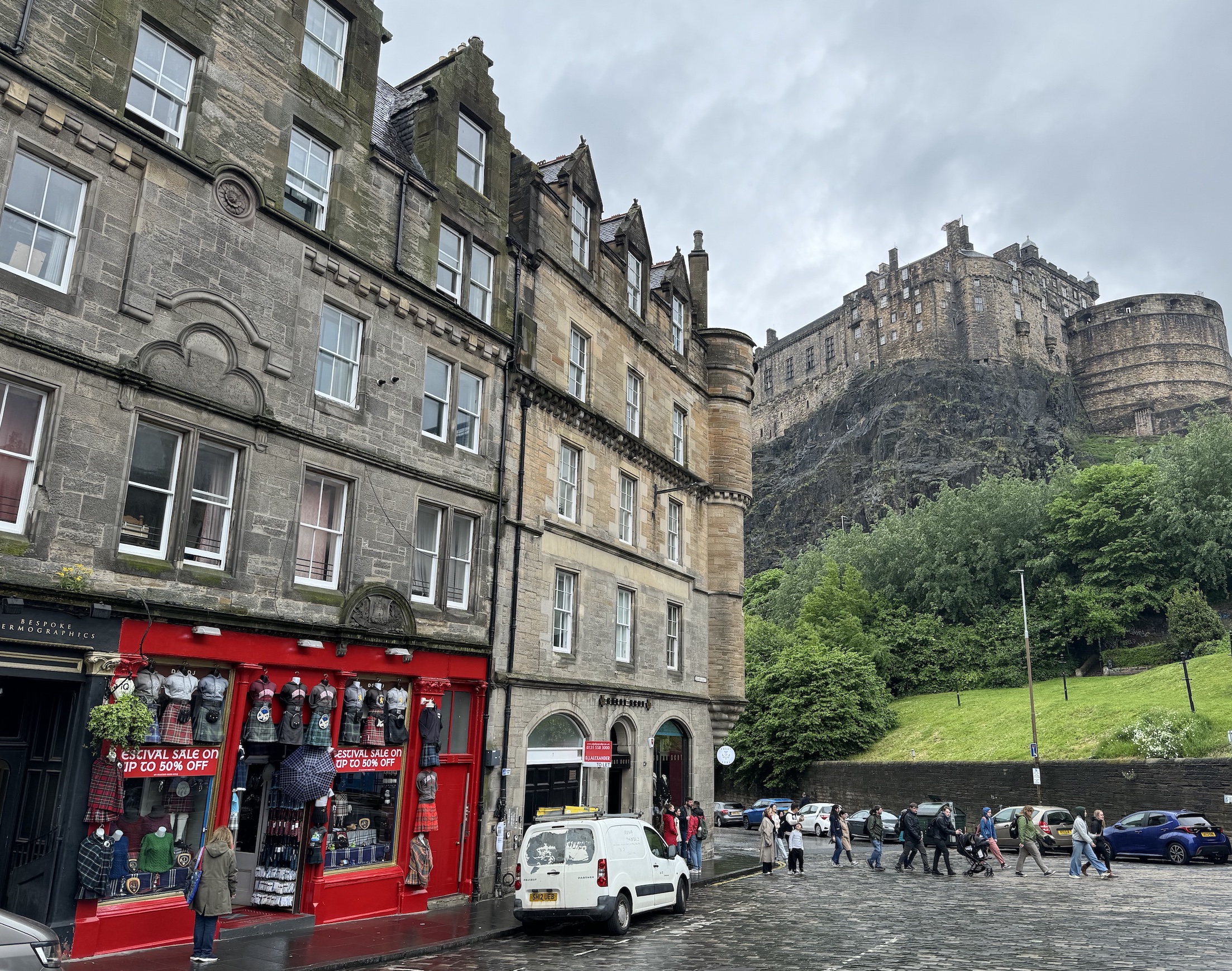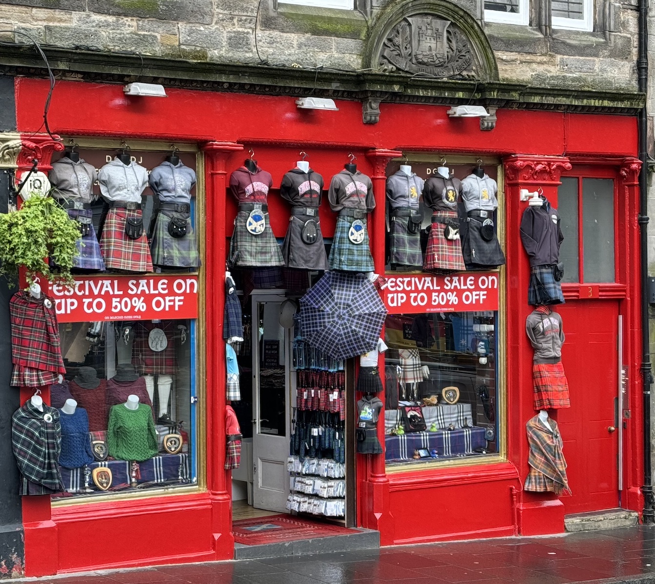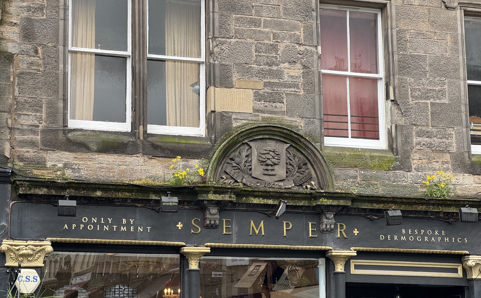 En ville, à côté d’une boutique de souvenirs (peinte en rouge), se trouve une autre boutique surmontée de l’adverbe latin Semper (“Toujours”) et d’un écusson mentionnant la ville de Glasgow.