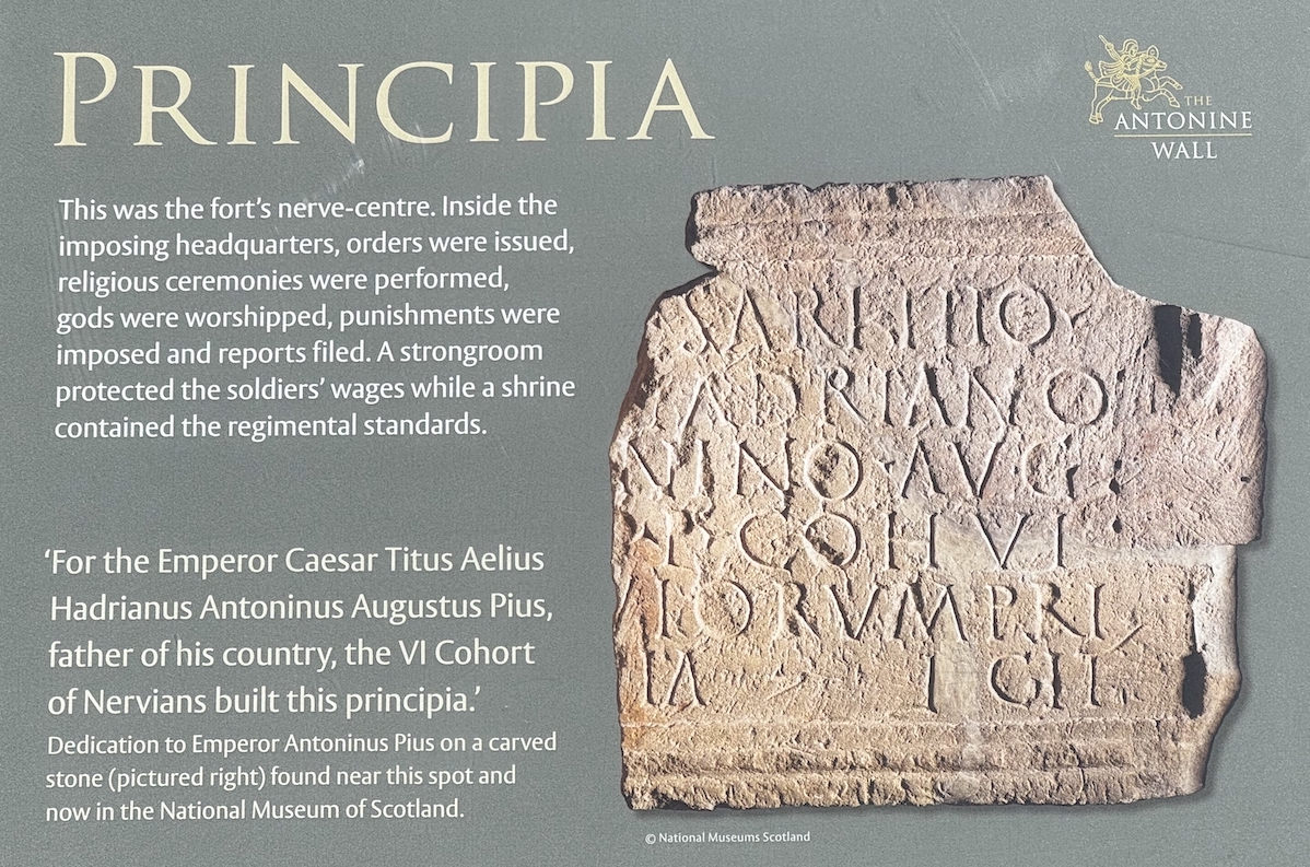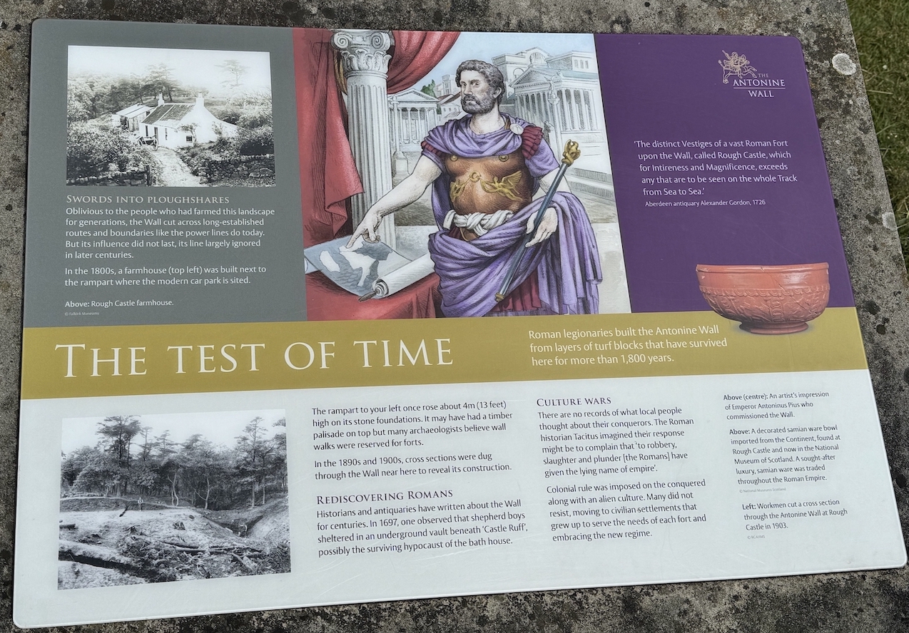 Sur un panneau explicatif près du “mur d’Antonin”, l’empereur (qui, de fait, n’a jamais quitté Rome pour conquérir l’Écosse) est représenté le doigt posé sur une carte à l’emplacement de ce “mur” !