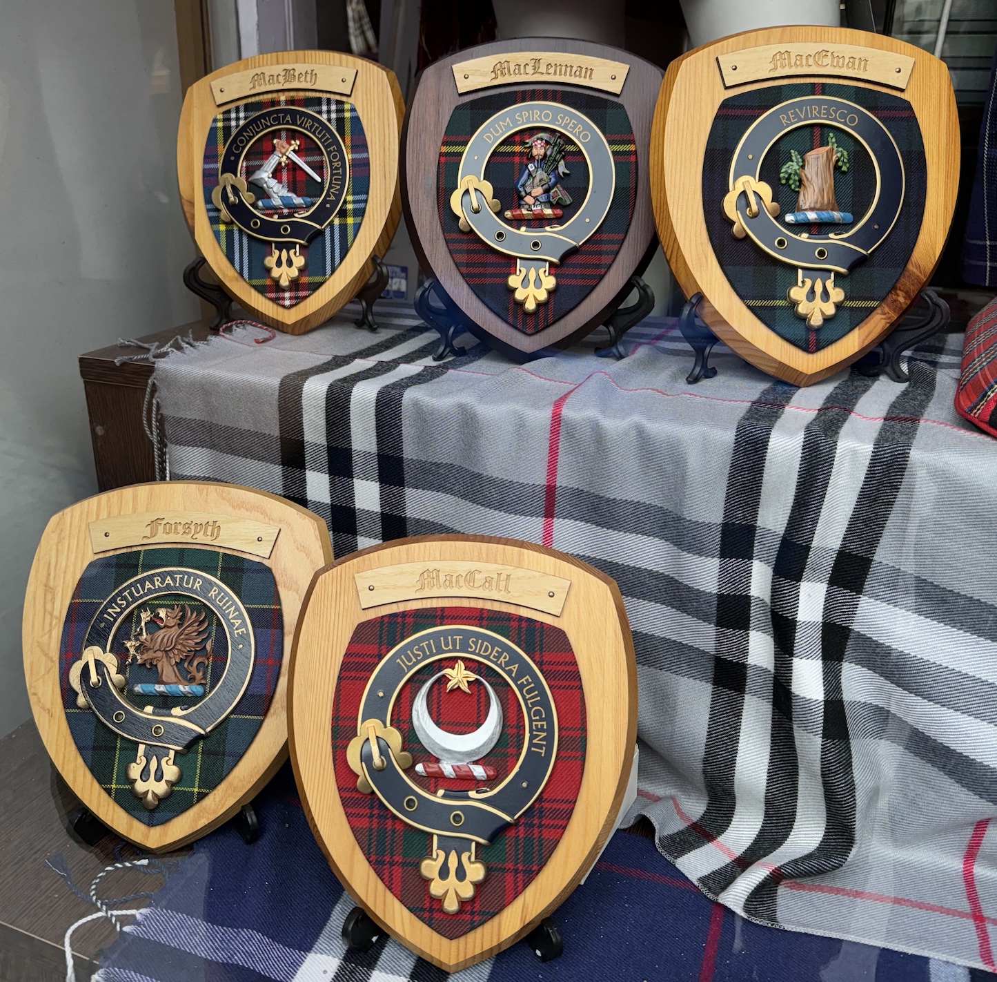 Dans la vitrine de la boutique de souvenirs sont exposées des plaques portant les armoiries de divers clans écossais.