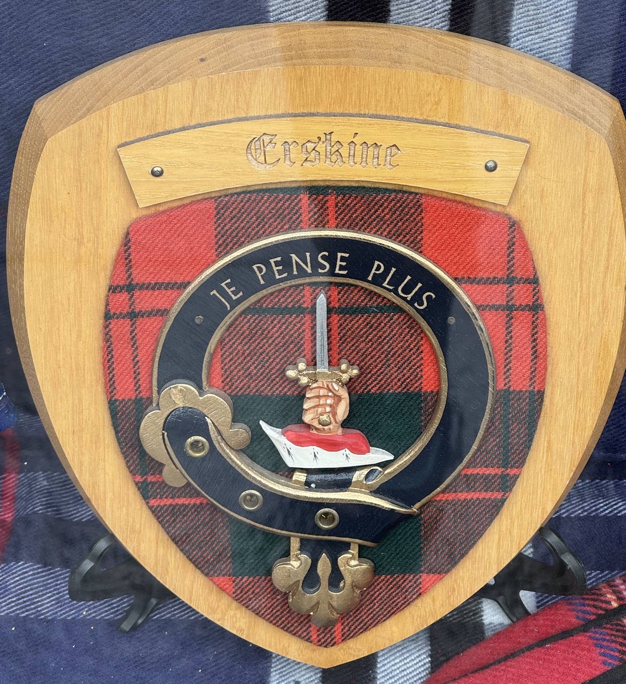 On remarque que les cinq plaques, faites à la main et présentant des cottes d’armes placées sur des morceaux d’authentiques tartans, arborent une devise en latin. Afin de connaître la traduction anglaise officielle, j’ai consulté un site web d’intérêt général sur l’héraldique en Écosse. Mais j’ai constaté qu’il y avait parfois des erreurs.