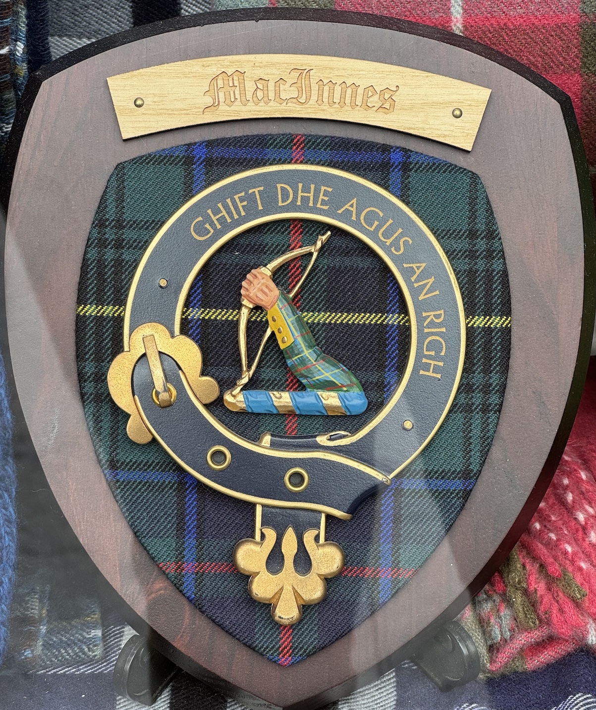 La phrase en gaélique du clan Mac Innes signifie ‘By the Grace of God and the King’, “Par la Grâce de Dieu et du Roi”.
