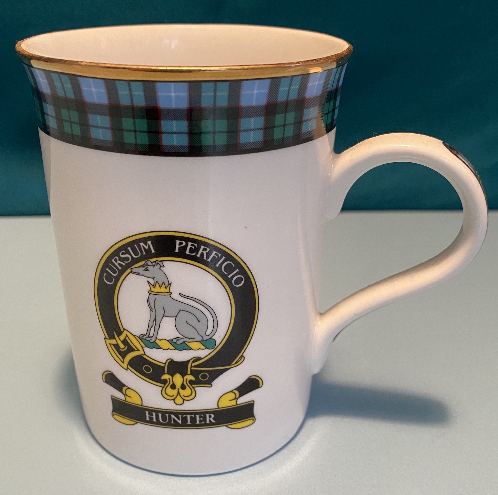 Le clan Hunter, illustré par un chien de chasse (‘hunter’ en anglais désigne le chasseur et le chien de chasse — image qui crée un jeu de mot sur le nom de famille), a pour devise latine Cursum perficio, dont la traduction anglaise officielle est ‘I have completed the course’, et littéralement, en français, “J’accomplis ma course”.