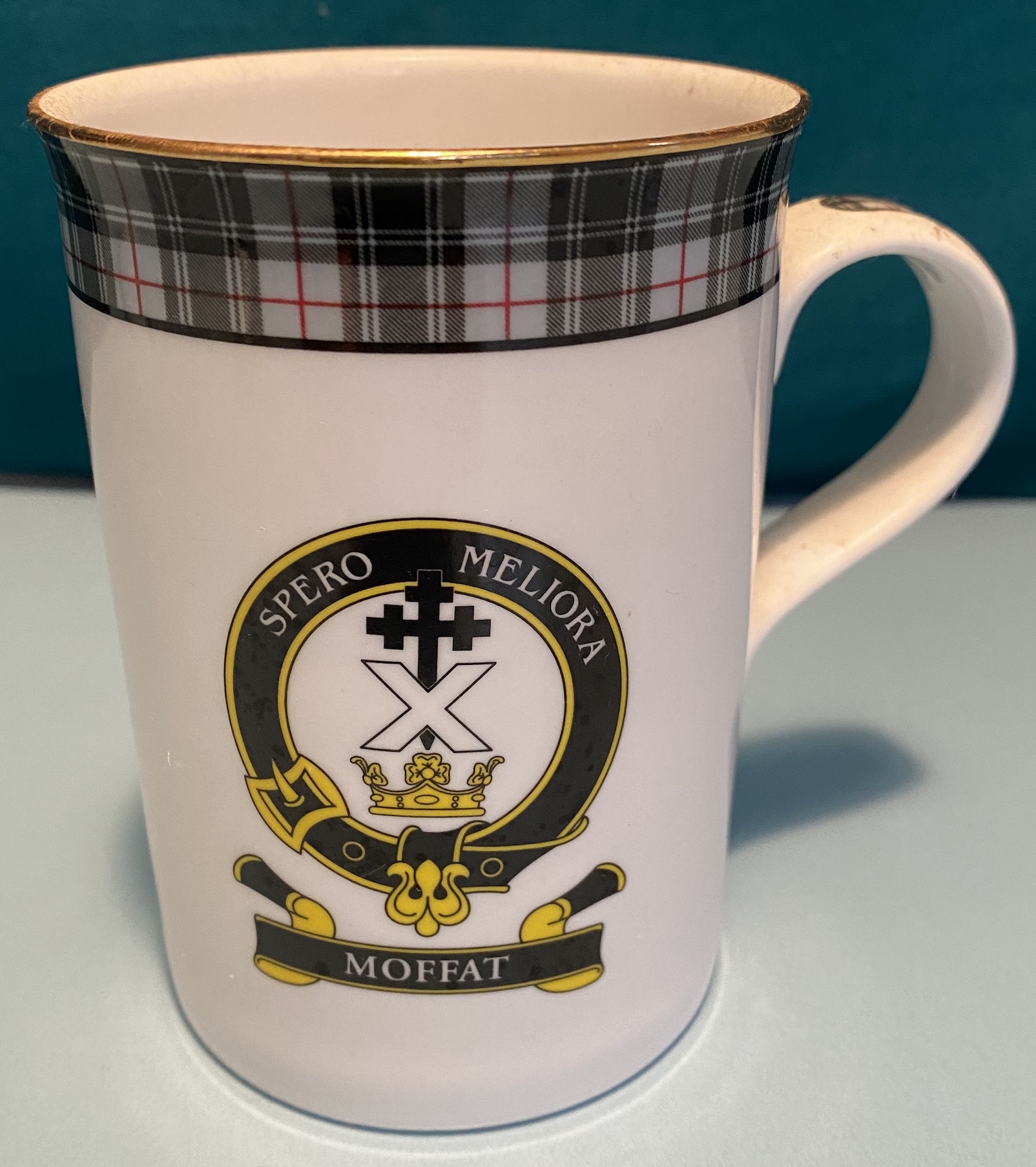 Le clan Moffat, qui a toujours eu des liens avec l’Église (au XIIIè siècle, l’un d’eux fut évêque de Glasgow) — d’où la croix noire — a pour devise Spero meliora, ‘I hope for better things’, “J’espère le meilleur” (littéralement, “J’espère de meilleures choses”).