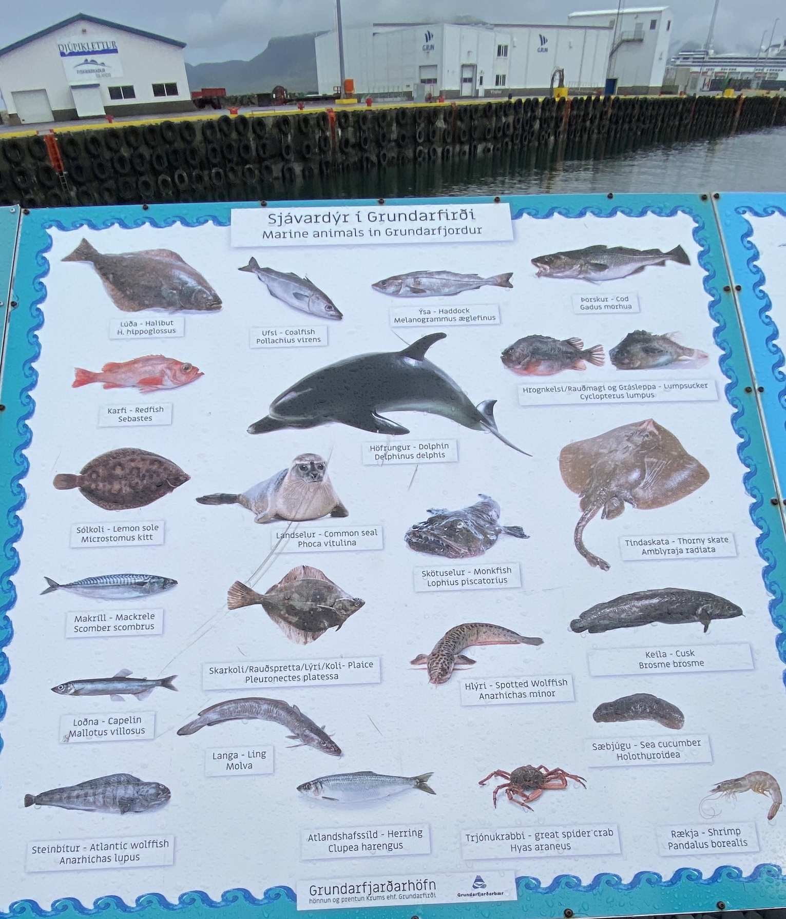 C’est pourquoi, il n’est pas étonnant de voir sur le quai de l’embarcadère ces cartes zoologiques bilingues (islandais/latin) d’animaux marins et d’oiseaux gravitant autour de Grundarfjördur.