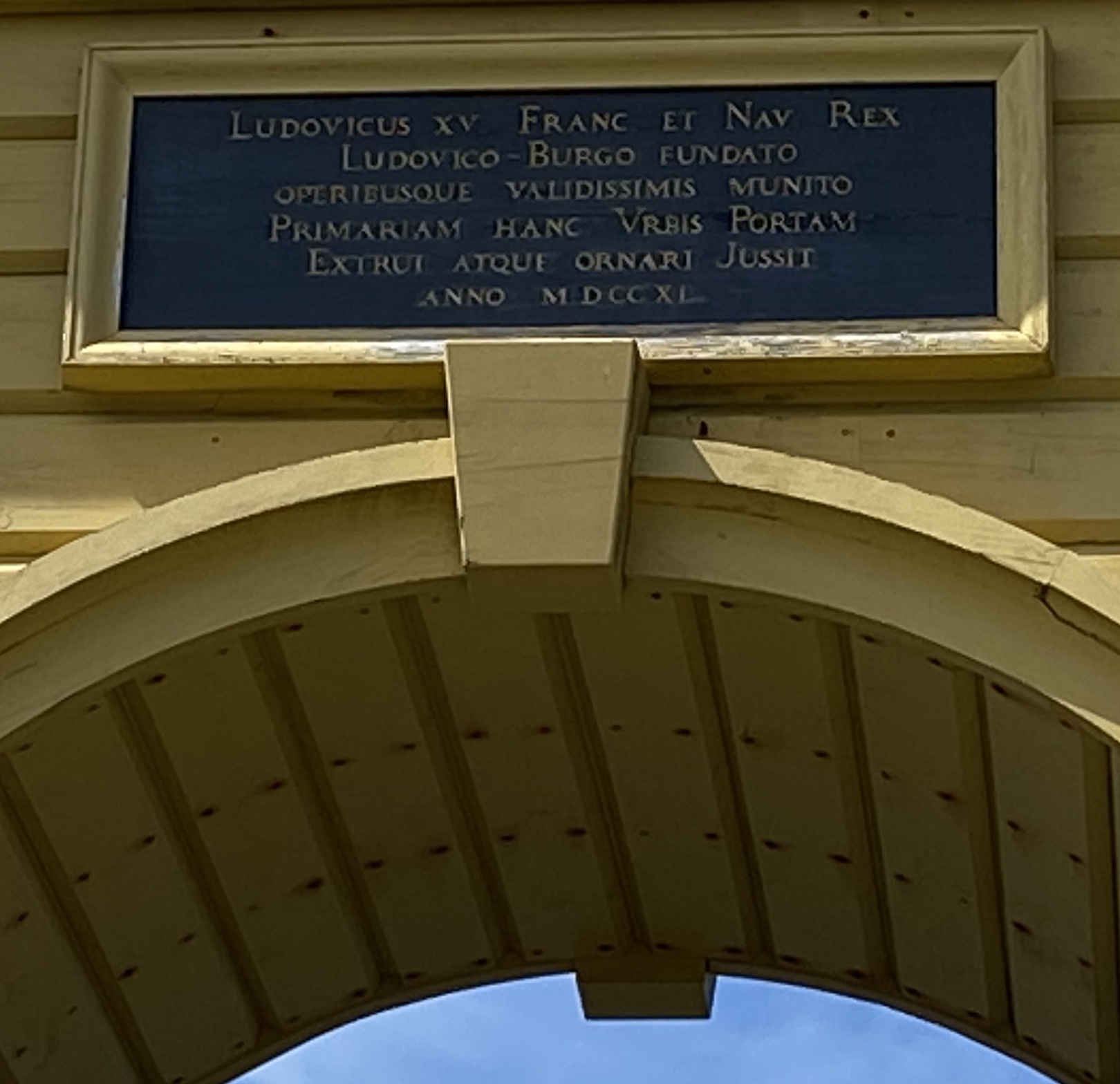 Au-dessus de l’arc de la porte royale, se trouve une inscription en latin : Ludovicus XV Franc. et Nav. Rex / Ludovico – Burgo fundato / operibusque validissimis munito / Primariam hanc Urbis portam / Extruit atque ornari jussit. / Anno MDCCXL — dont je propose la traduction suivante : “Louis XV, roi de France et de Navarre, une fois Louisbourg fondée et fortifiée grâce à des travaux très solides, a fait construire cette porte, au premier rang de la ville, et a ordonné de l’embellir, en 1740.”