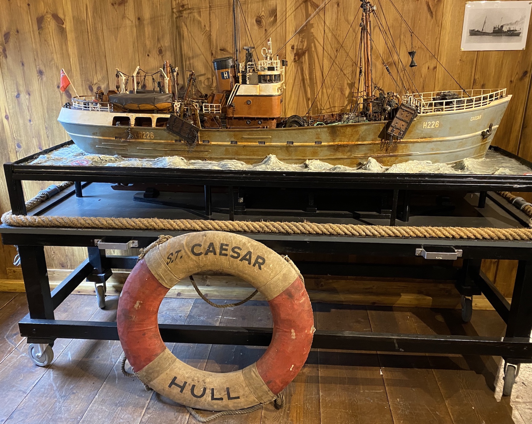 J’ai eu l’œil attiré par la maquette d’un chalutier, nommé H. 226 Caesar, et une bouée portant le même nom ainsi que celui de la ville anglaise de Hull. Cependant, le destin de ce bateau n’a rien à voir avec celui de Jules César, sauf, peut-être, une fin tragique !