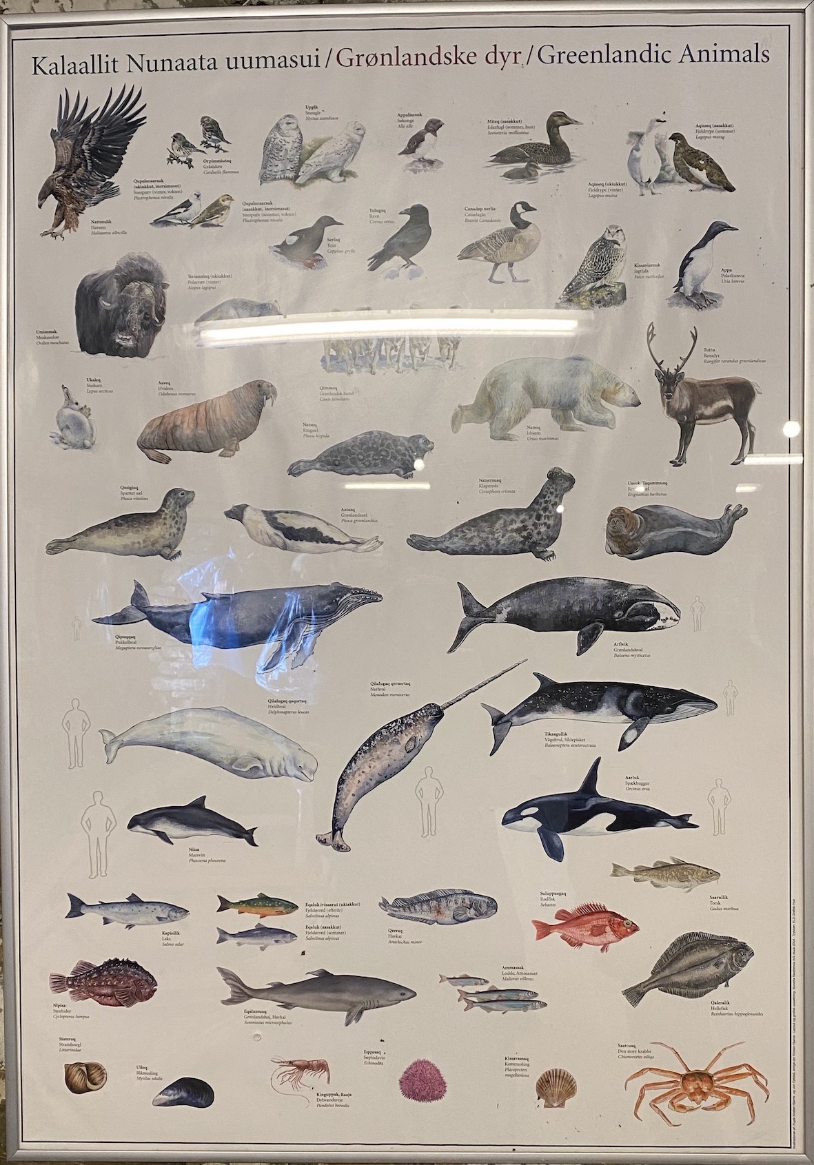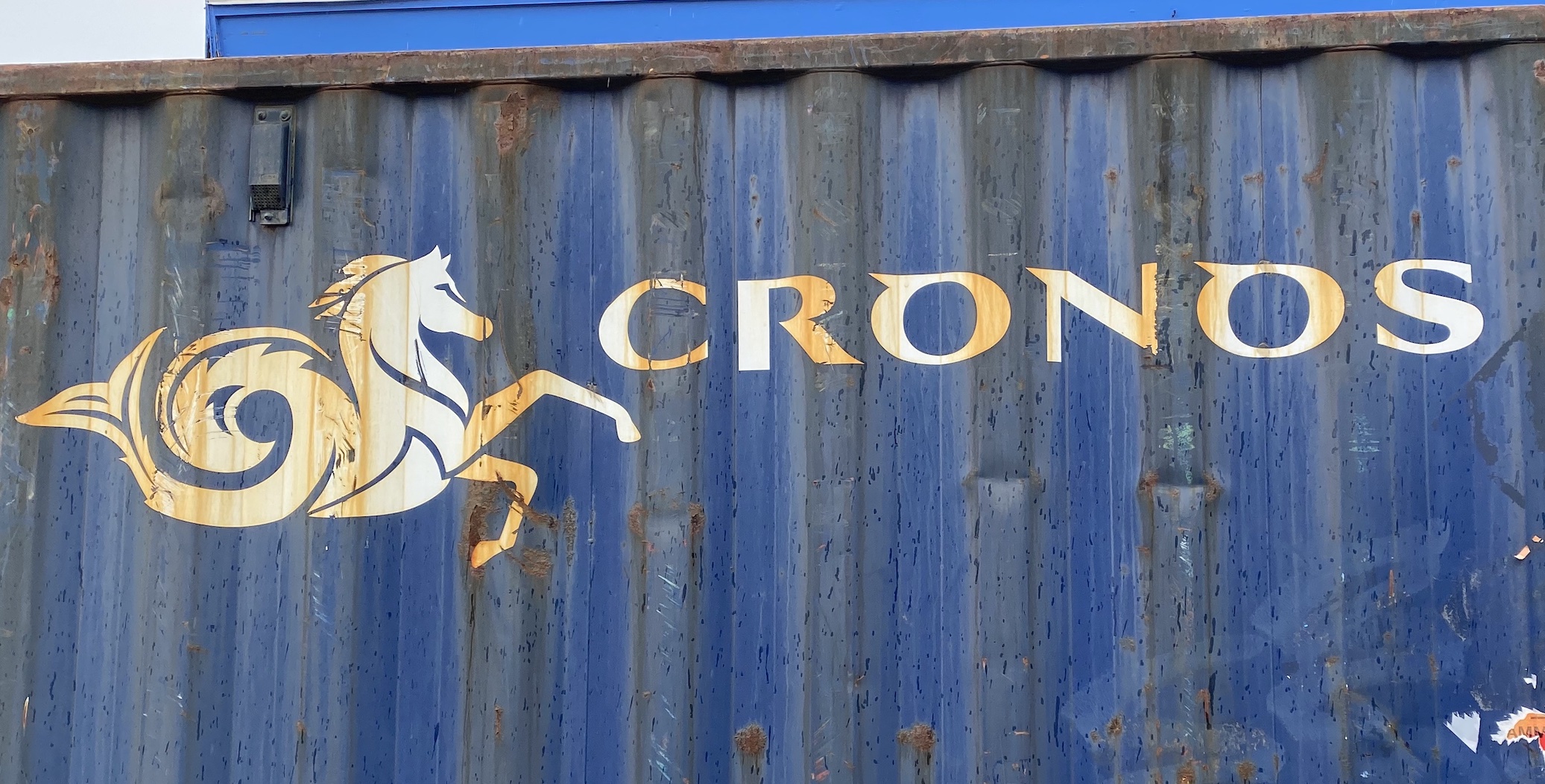 Sur le quai du port il y avait un panneau avec une affiche qui nommait les différents animaux en groenlandais ainsi qu’en latin — ce qui est bien normal puisque c’est encore la langue scientifique de la zoologie. Et, en passant devant des entrepôts portuaires, j’ai vu un conteneur bleu sur lequel figuraient le nom de Cronos et le dessin d’un cheval marin à la queue de poisson. Étrange association, car Cronos est le nom latinisé (du grec Κρονος) du dieu Saturne ; et le cheval marin est un des attributs du dieu Neptune !