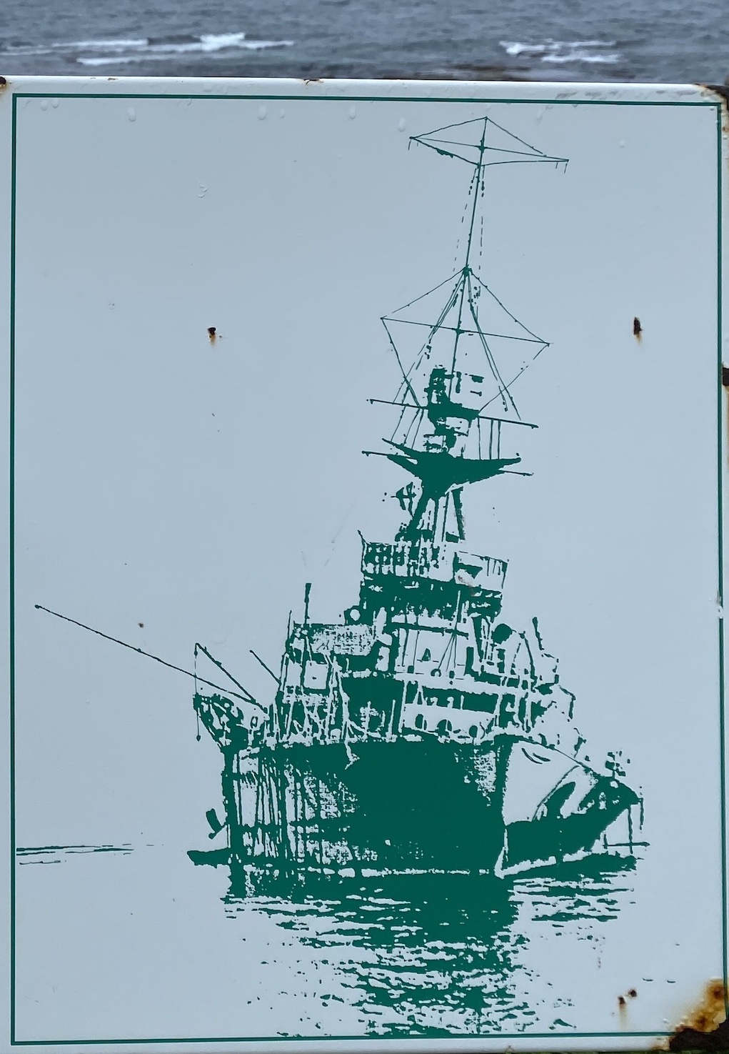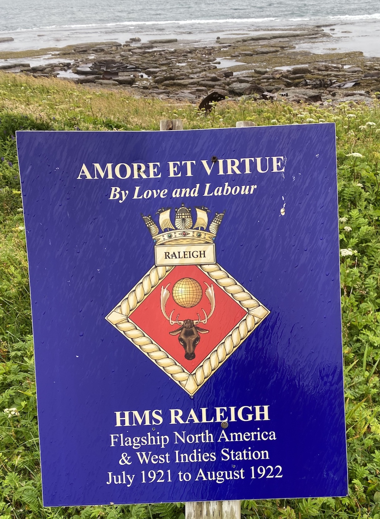 Après avoir, depuis le phare, marché un à deux kilomètres sur la Raleigh trail, nous avons pu voir l’épave du bateau, qui, finalement, a été complètement détruit en 1926. Près du site, un panneau porte les armoiries du navire et sa devise latine — écrite avec une faute d’orthographe — car il faudrait lire : Amore et virtute, By Love and labour (traduction anglaise), Avec amour et bravoure (le nom latin virtus ayant de nombreuses traductions en français).