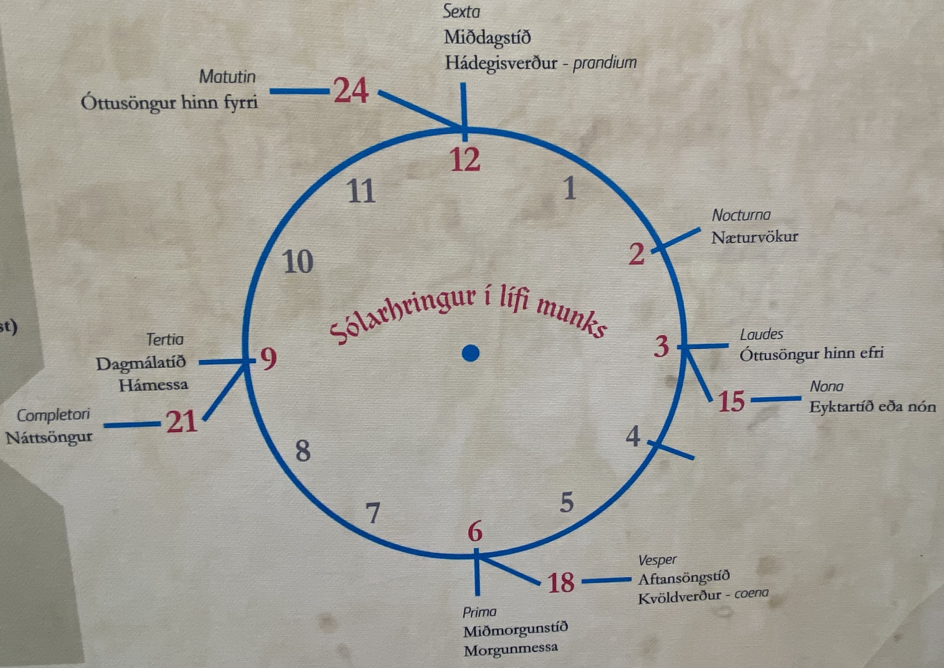 Ce cloître, fondé en 1493, abritait des religieux qui suivaient la règle augustinienne. Dans le musée attenant au site, on peut lire de nombreux documents écrits en latin et en langue islandaise. Par exemple, sur l’horaire des offices, on reconnaît en haut du chiffre 12 le mot Sexta (la sixième heure du jour solaire) où l’on prend le prandium, c’est-à-dire le déjeuner.